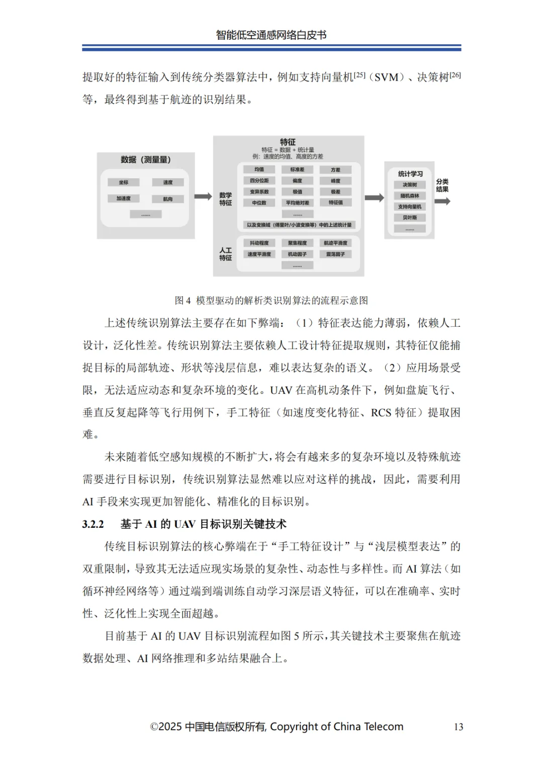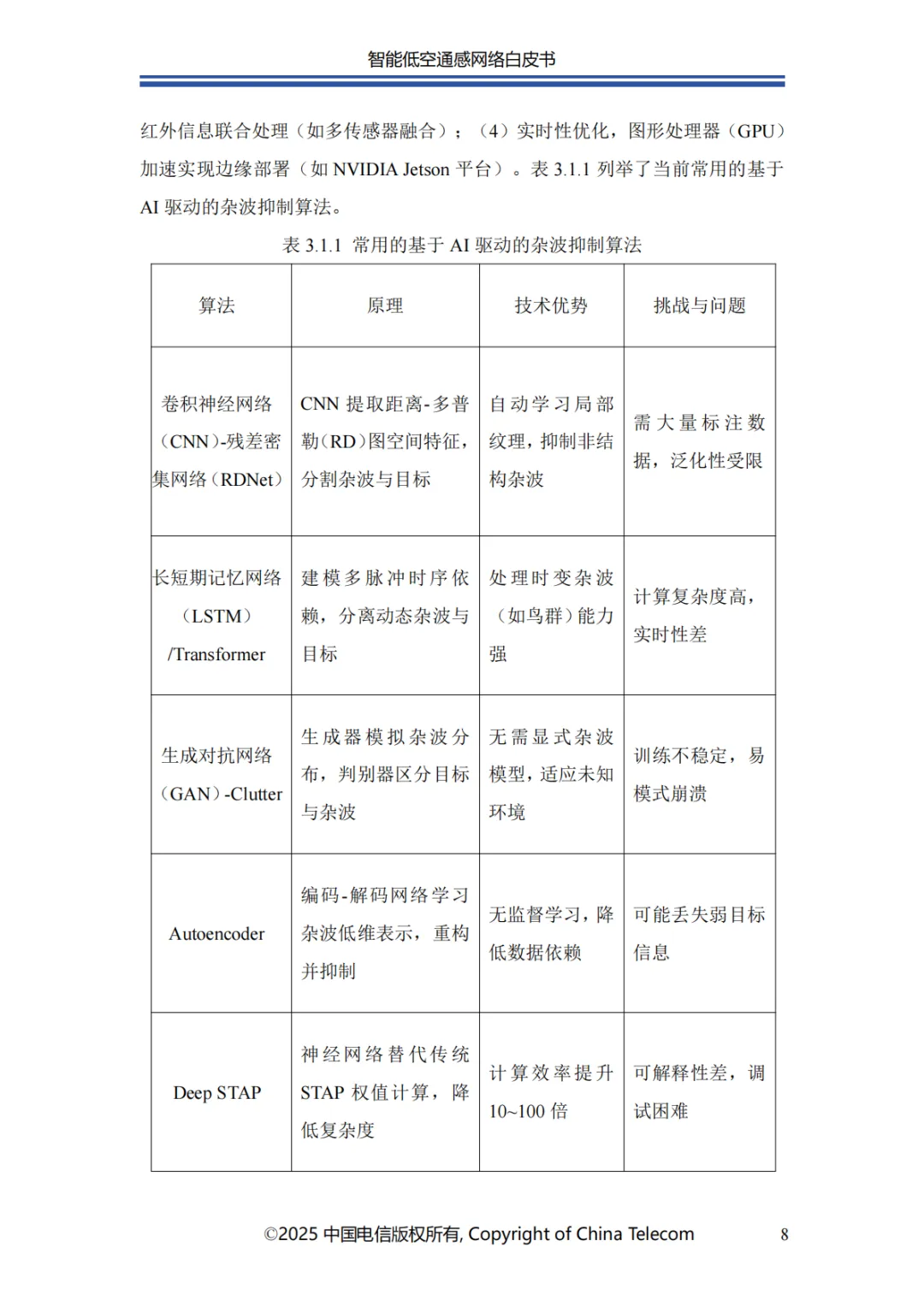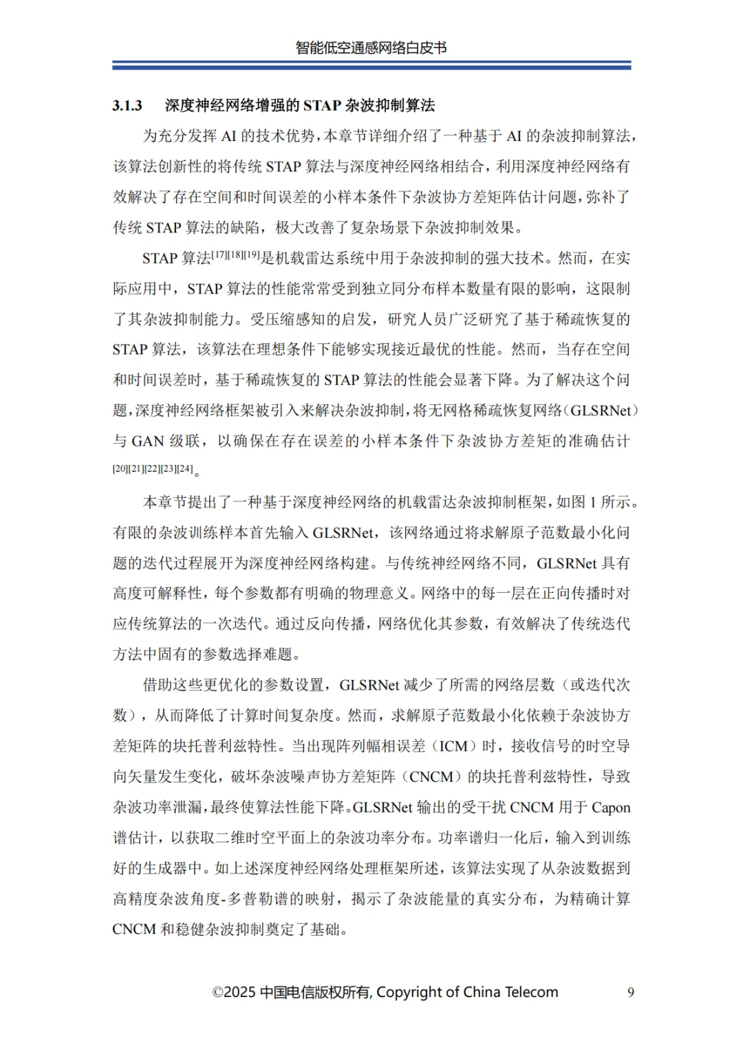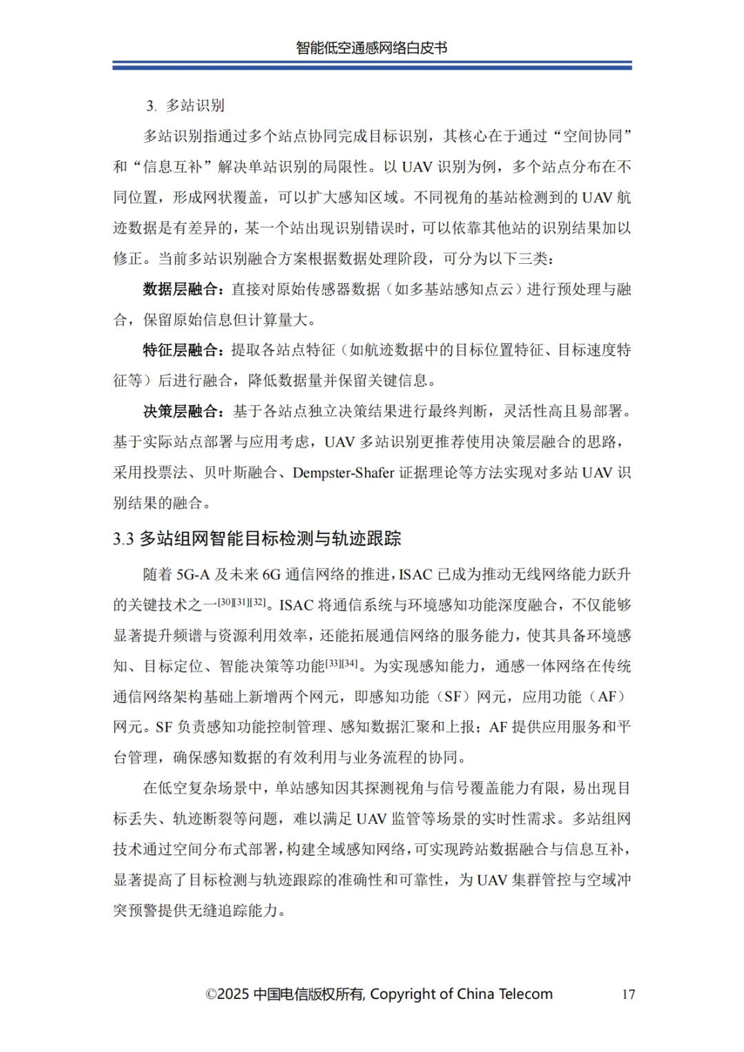 本白皮书首先阐述了智能低空通感网络的发展概况;其次介绍了智能低空通感网络的多种应用场景;随后针对应用场景所需的关键能力,分析了传统非智能通感技术面临的问题与挑战,进而提出创新性解决方案;在杂波抑制方面,提出了融合 AI 技术与传统算法的深度神经网络增强的空时自适应处理(STAP)算法,以实现智能杂波抑制;针对目标识别的难题,介绍了基于 AI 的 UAV 目标识别关键技术,保障对目标的精准识别;为应对目标检测与轨迹跟踪的挑战,提出了AI 赋能的多站检测跟踪方案;此外,还创新性地提出了一种多源感知融合技术架构,有效提升了低空感知的可靠性;最后对智能低空通感网络的未来发展进行总结与展望。
