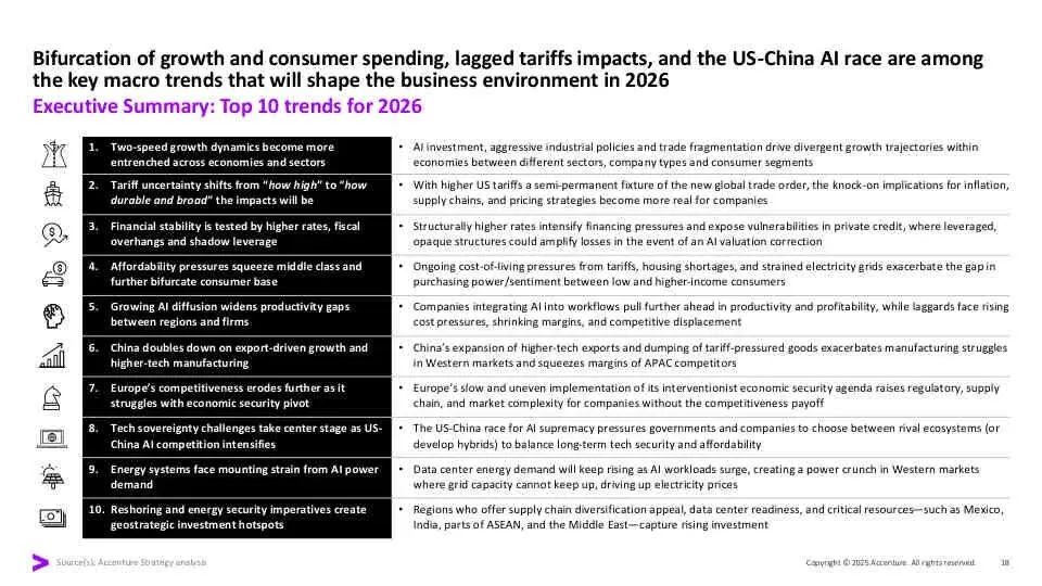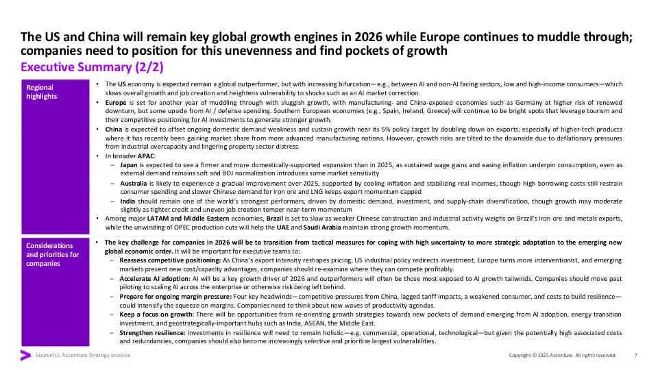 2026年全球经济将延续“低增长、高分化、强韧性”的特征。在经历了2025年高政策不确定性和地缘政治摩擦后,虽然部分不确定性有所消退,但其滞后影响将更加深刻地重塑全球格局。企业必须从应对不确定性转向主动适应一个由AI赢家通吃、地缘经济碎片化和中国出口竞争加剧所定义的“新常态”。