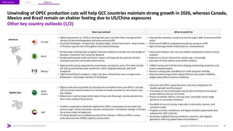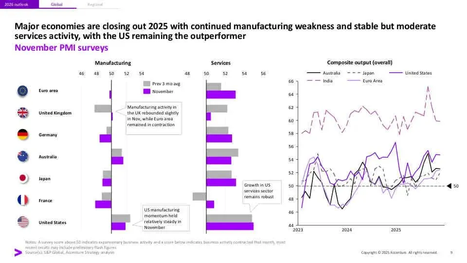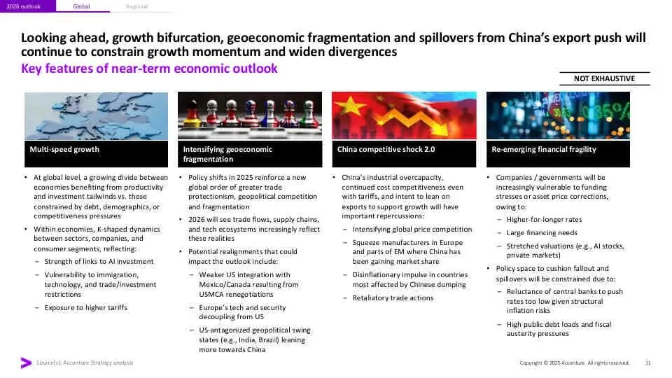 总体基调: 温和但不均衡的增长。全球经济在2025年展现出意外韧性后,2026年将面临增长动能减弱的风险。