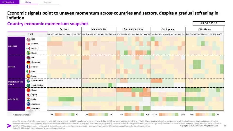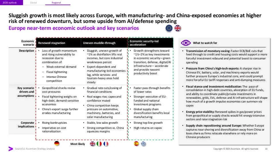 - 欧洲: 继续“泥足深陷”(muddling through),增长乏力。制造业和对华出口依赖度高的国家(如德国)风险更高,而南欧国家(西班牙、爱尔兰等)凭借旅游业和AI投资成为亮点。