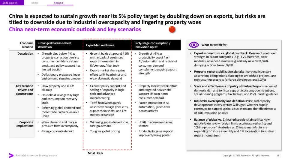 - 中国: 通过加倍押注出口(尤其是高科技产品)来对冲国内需求疲软,努力维持接近5%的增长目标。但面临工业产能过剩和房地产问题带来的下行风险。