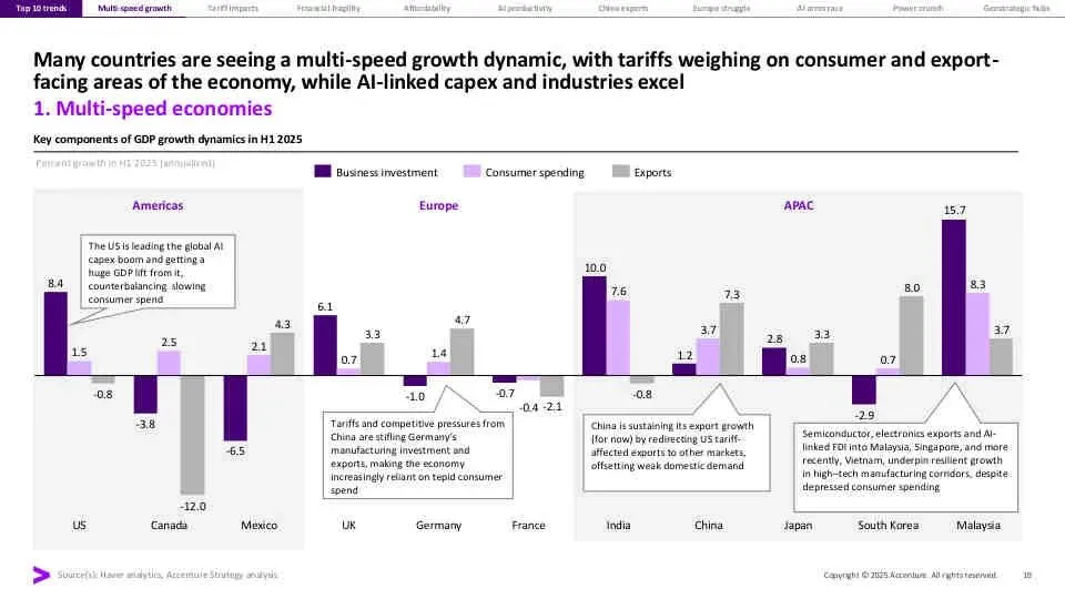 - 美国: 预计仍是全球增长的领跑者,但内部呈现严重分化(AI vs. 非AI行业、高收入 vs. 低收入群体),并面临AI市场回调的脆弱性。
