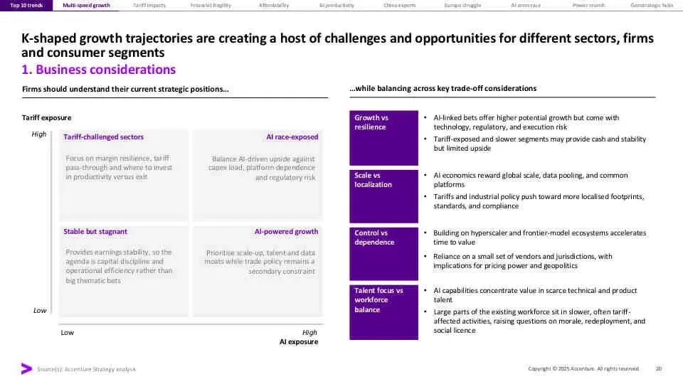 - 双速增长动态加剧: AI投资、产业政策和贸易碎片化导致经济体内部及之间增长差距拉大。