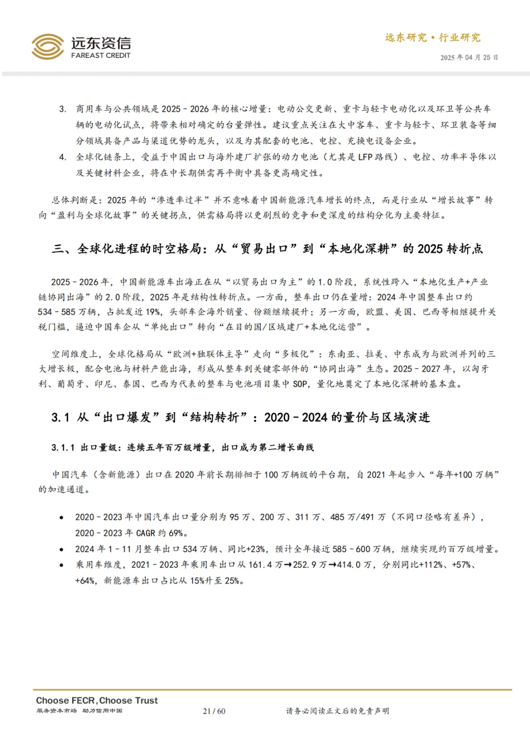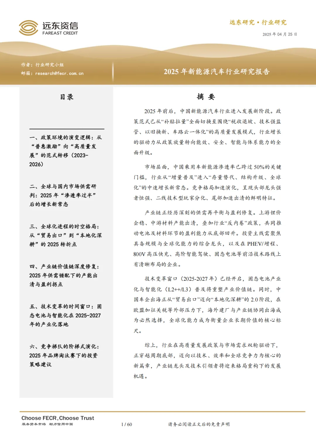 技术变革窗口(2025-2027 年)已经开启,固态电池产业化与智能化(L2++/L3)普及将重塑产业价值链。同时,中国车企出海正从“贸易出口”迈向“本地化深耕”的 2.0 阶段,在欧盟加征关税等外部压力下,海外建厂与产业链协同出海成为必然选择,全球化能力成为衡量企业长期价值的核心标尺。