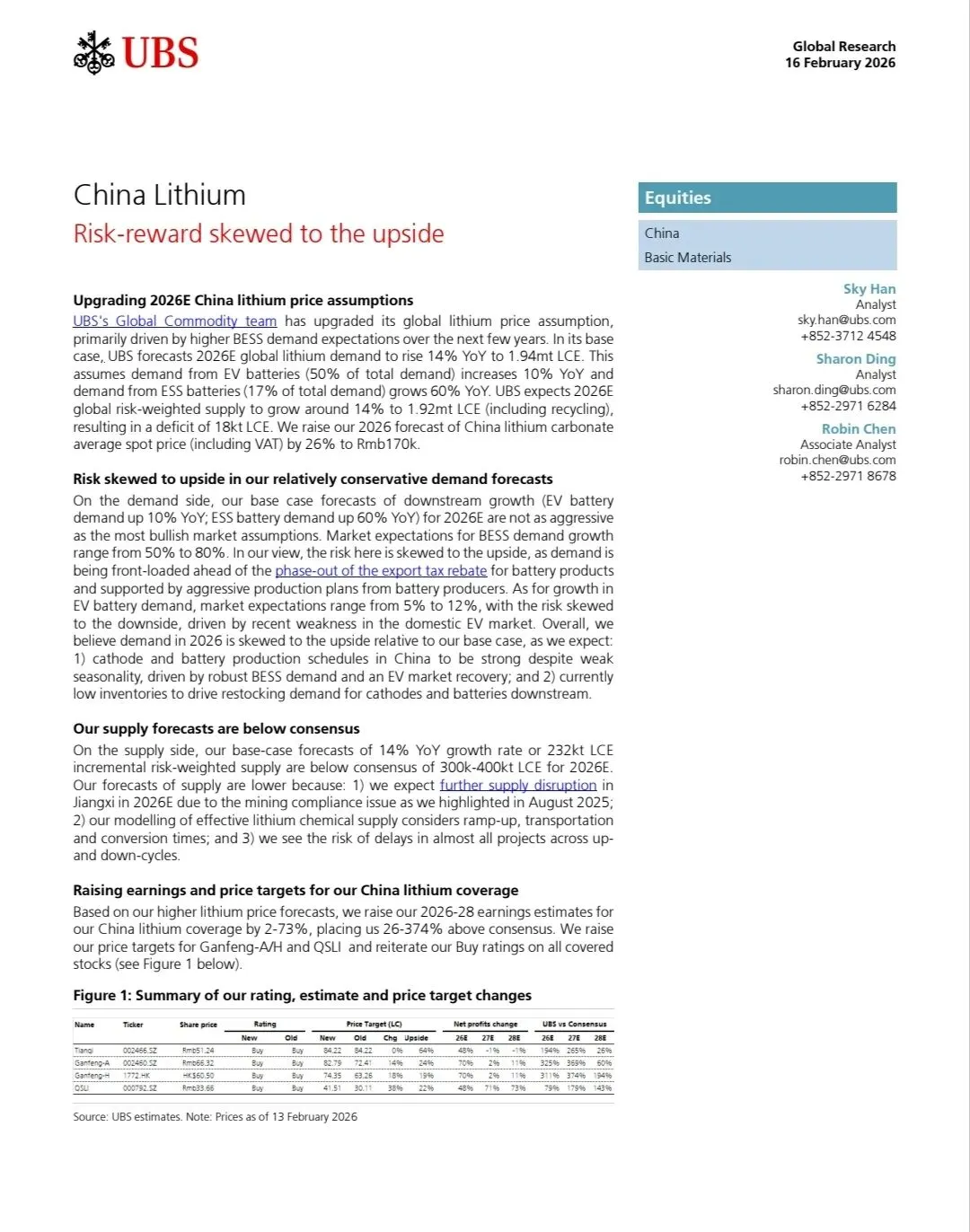 基于供需缺口(预计短缺1.8万吨LCE),瑞银将2026年中国碳酸锂平均现货价格预测上调26%至17万元/吨(含增值税)。