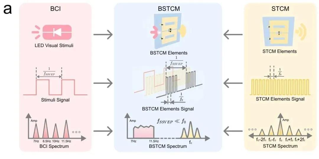 研究人员发现,稳态视觉诱发电位(SSVEP)与时空编码(STC)超表面的特性存在天然的契合点,可以巧妙结合,从而突破传统BCI的局限。