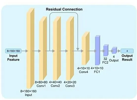 信号首先经过4个切比雪夫Ⅰ型带通滤波器组成的滤波器组处理,分离不同子带,接着通过快速傅里叶变换提取幅度谱,加权求和强化低频分量贡献,增强特征可辨性。随后,信号幅度谱与预计算参考谱进行外积运算,生成特征图,采用轻量级卷积神经网络,包含4个卷积层、2个线性层及残差连接,对特征图进行分类。