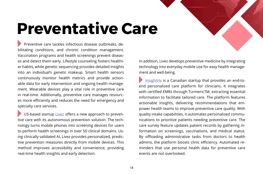 预防性医疗 (Preventative Care, 9%):利用AI和移动技术进行早期筛查、风险预测和个性化健康干预。