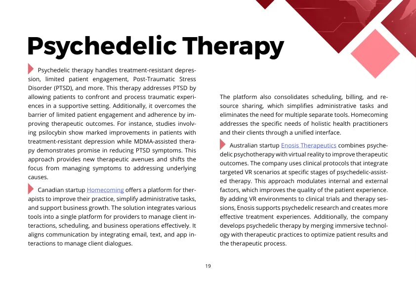 - 代表: Enosis Therapeutics(澳,VR+迷幻疗法)、Homecoming(加,治疗师管理平台)。