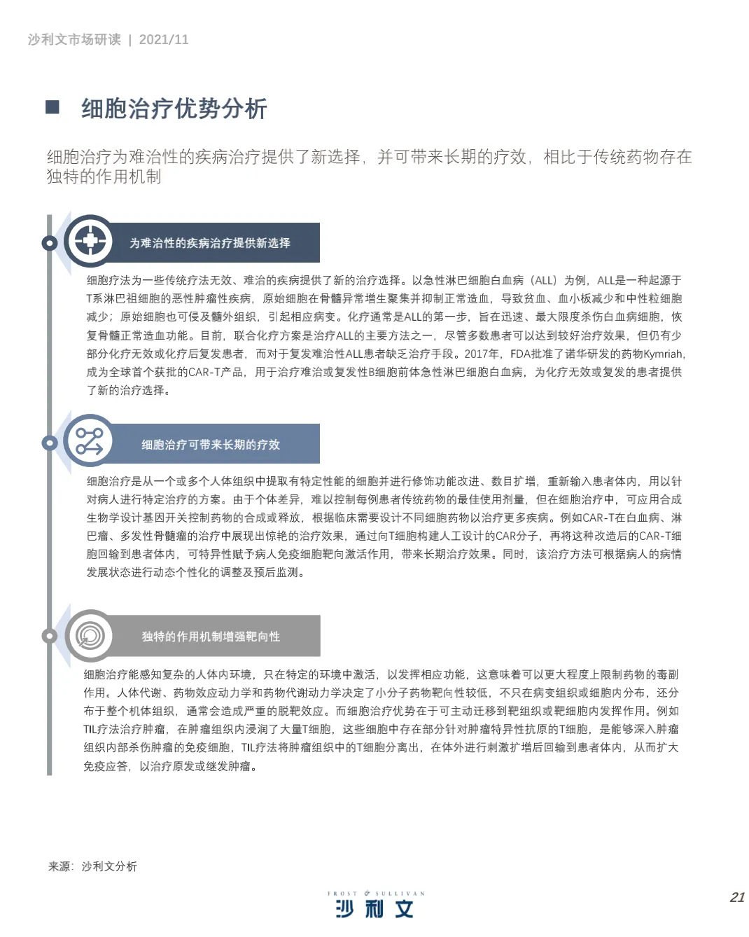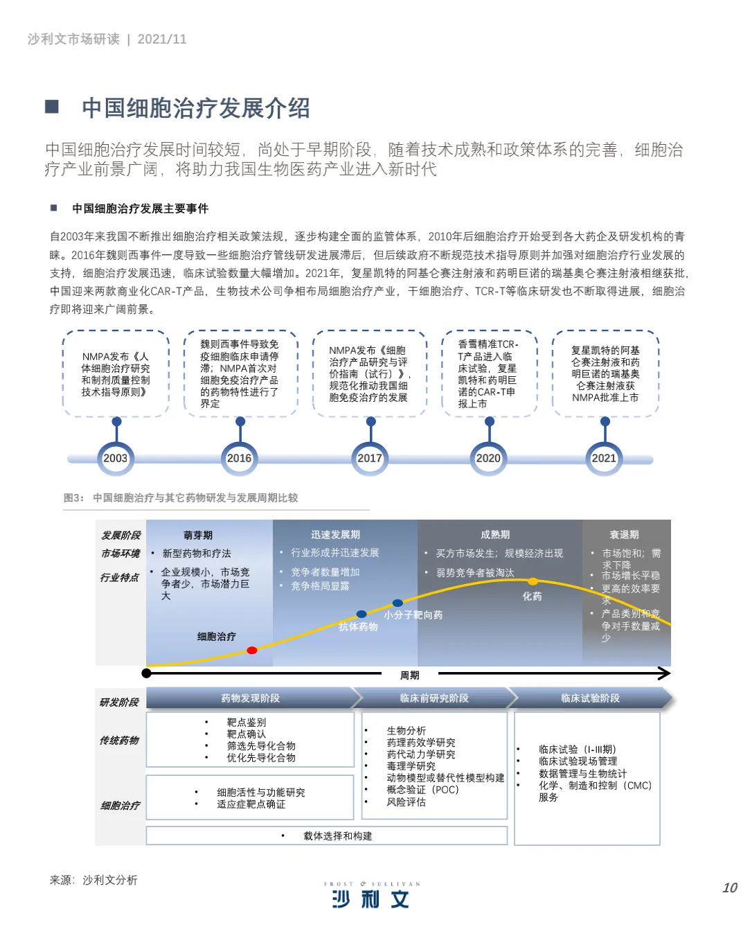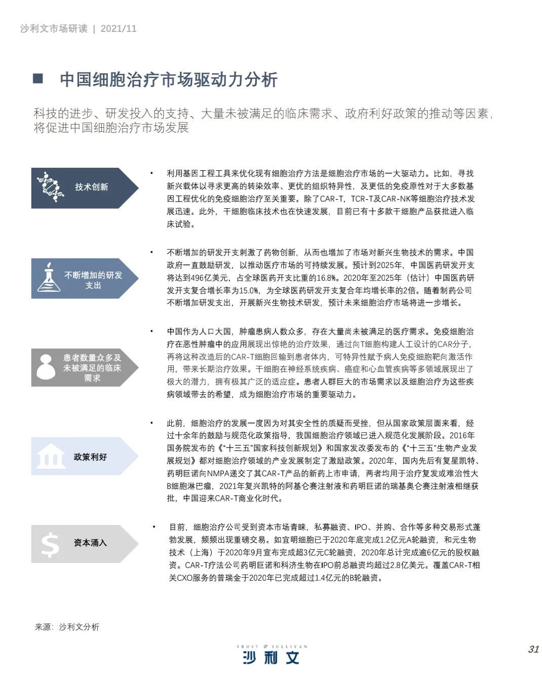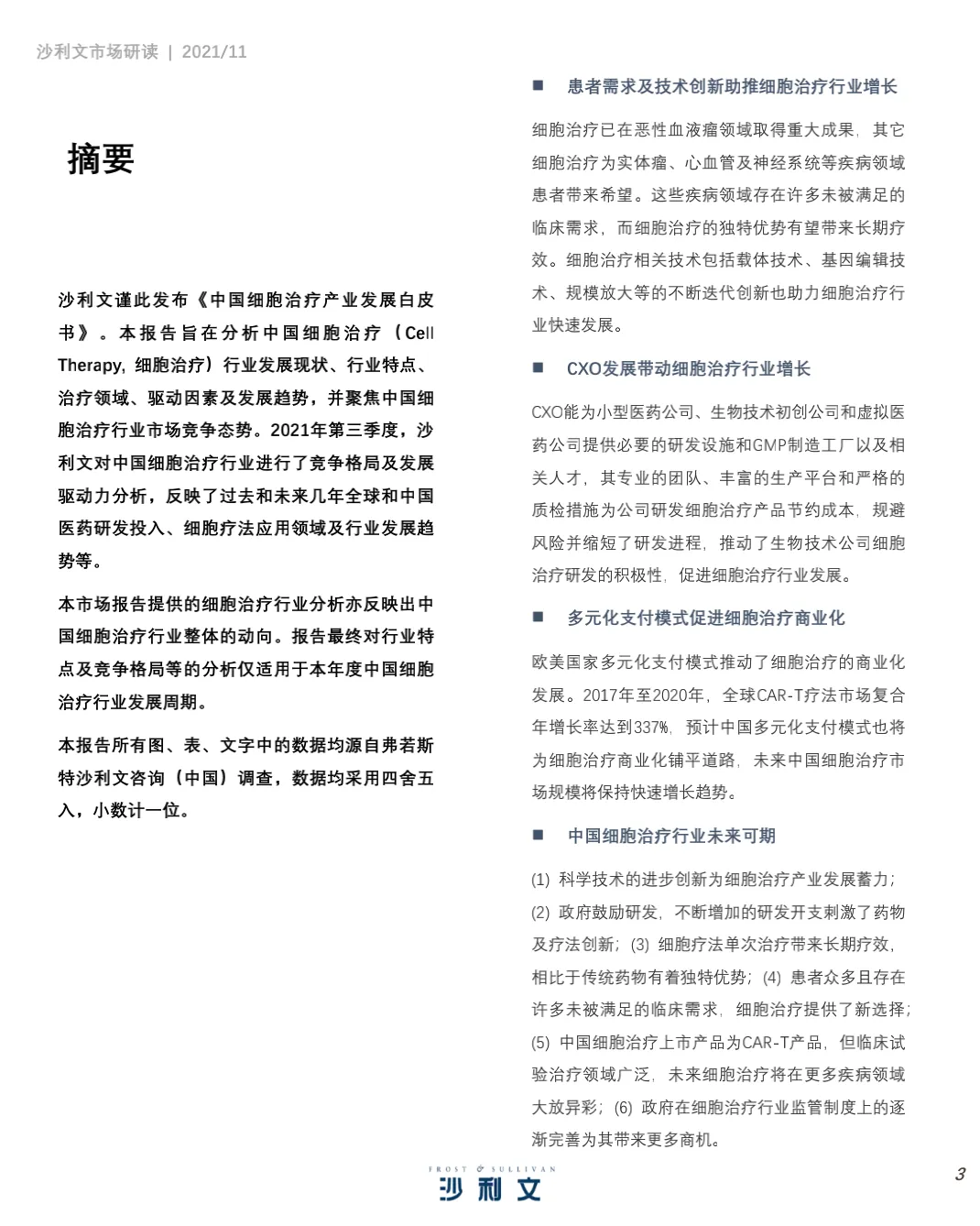 沙利文谨此发布《中国细胞治疗产业发展白皮书 》。本 报告 旨在分 析中国 细胞 治疗 ( CellTherapy, 细胞治疗)行业发展现状、行业特点、治疗领域、驱动因素及发展趋势,并聚焦中国细胞治疗行业市场竞争态势。2021年第三季度,沙利文对中国细胞治疗行业进行了竞争格局及发展驱动力分析,反映了过去和未来几年全球和中国医药研发投入、细胞疗法应用领域及行业发展趋势等。