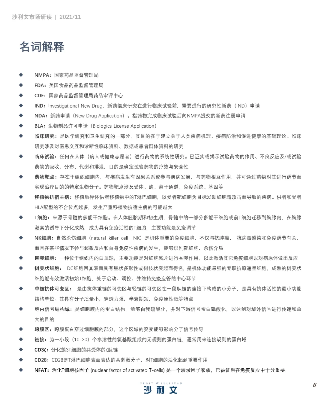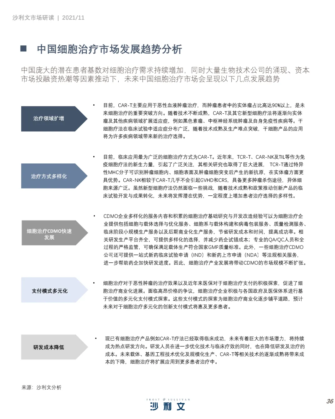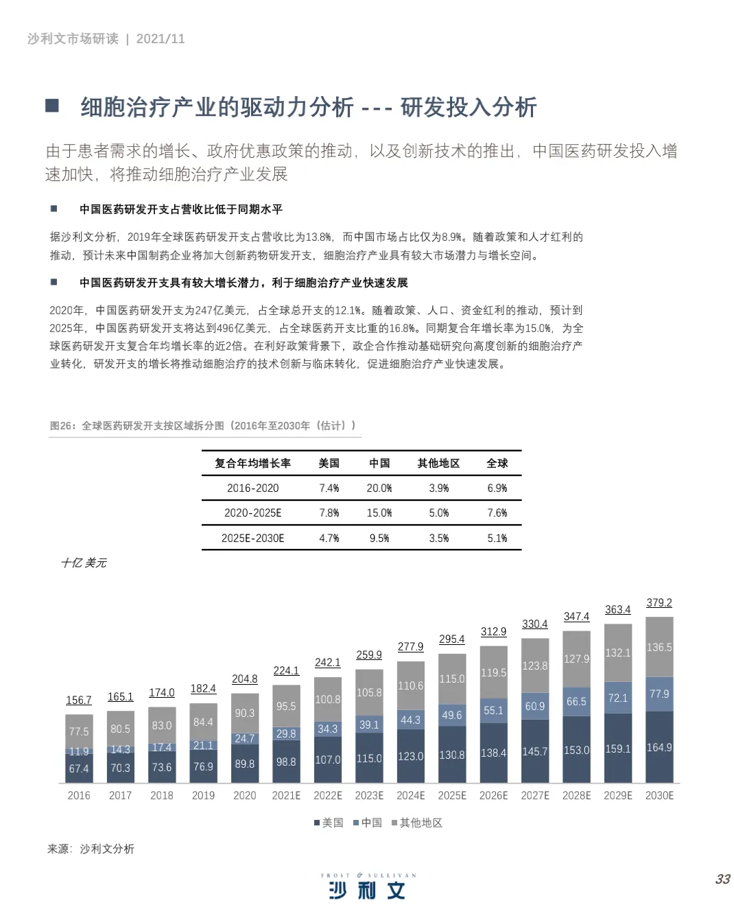 沙利文谨此发布《中国细胞治疗产业发展白皮书 》。本 报告 旨在分 析中国 细胞 治疗 ( CellTherapy, 细胞治疗)行业发展现状、行业特点、治疗领域、驱动因素及发展趋势,并聚焦中国细胞治疗行业市场竞争态势。2021年第三季度,沙利文对中国细胞治疗行业进行了竞争格局及发展驱动力分析,反映了过去和未来几年全球和中国医药研发投入、细胞疗法应用领域及行业发展趋势等。