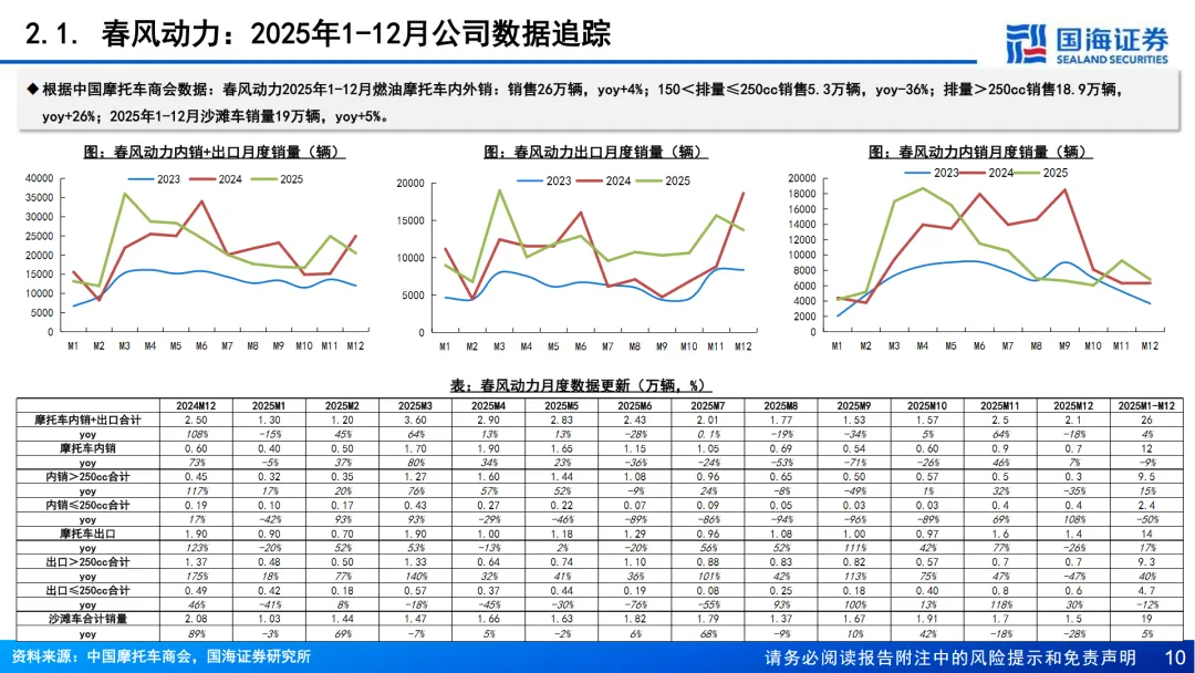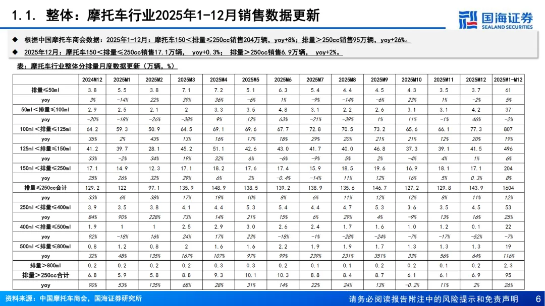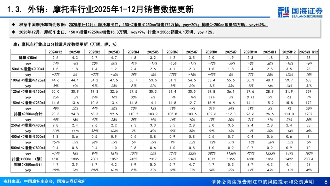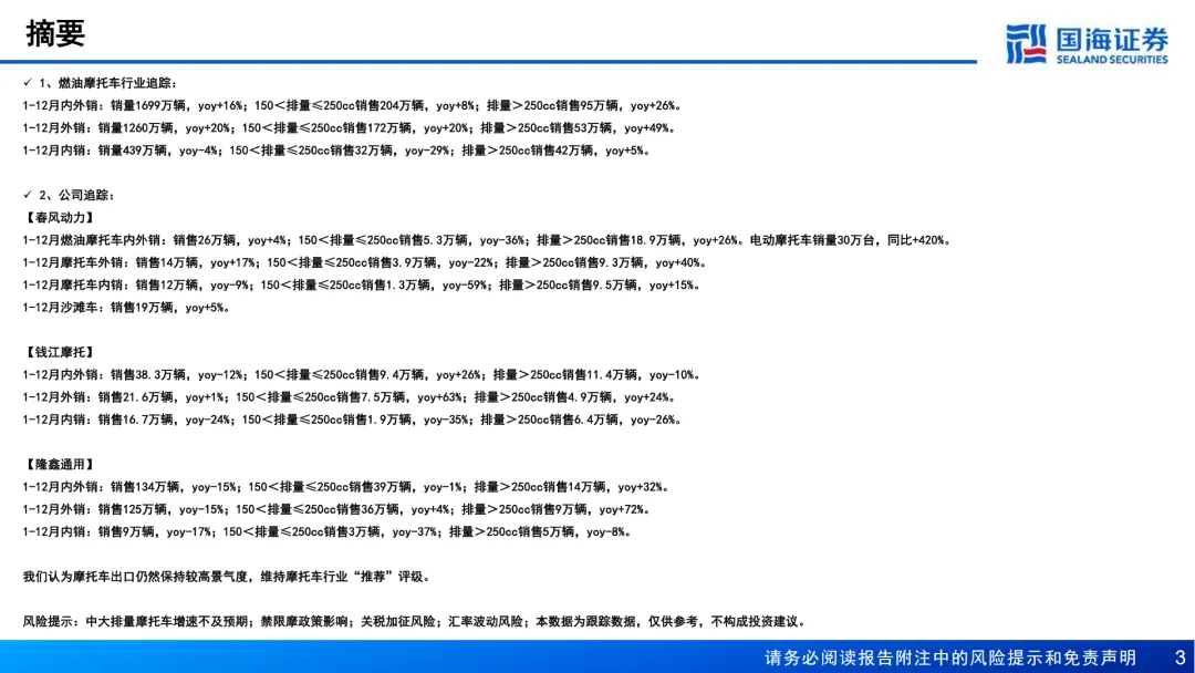 本篇行业报告可以通过扫下方知识星球下载。39元就可以下载星球所有报告。免费提供报告查找服务。摩托车行业在2025年展现出了积极的增长态势,特别是在出口市场上表现强劲。根据中国摩托车商会的数据,2025年1-12月摩托车行业内外销总量达到了1699万辆,同比增长了16%。其中,出口量为1260万辆,同比增长了20%,显示出国际市场对中国摩托车的强劲需求。在排量方面,排量大于250cc的摩托车销量增长尤为显著,达到了95万辆,同比增长了26%。在公司层面,春风动力的表现尤为突出。2025年1-12月,春风动力燃油摩托车内外销总量为26万辆,同比增长了4%。特别是在排量大于250cc的摩托车销量上,春风动力实现了18.9万辆的销售,同比增长了26%。此外,春风动力的电动摩托车销量也实现了突破,达到了30万辆,同比增长了420%,这一数据表明春风动力在新能源摩托车领域取得了显著进展。钱江摩托和隆鑫通用也在出口市场上取得了不错的成绩。钱江摩托1-12月外销量为21.6万辆,同比增长了1%,而隆鑫通用的外销量为125万辆,虽然同比下降了15%,但在排量大于250cc的摩托车销量上,隆鑫通用实现了9万辆的销售,同比增长了72%。整体来看,摩托车行业在2025年表现出了较强的增长势头,尤其是在出口市场和大排量摩托车领域。这一趋势的背后,可能是由于全球经济的复苏、消费者对于高性能摩托车的需求增加,以及中国摩托车企业在国际市场上的竞争力提升。然而,行业也面临着一些挑战,包括中大排量摩托车增速不及预期、禁限摩政策的影响、关税加征风险以及汇率波动风险等。因此,虽然摩托车行业维持了“推荐”评级,但投资者仍需关注这些潜在风险。免责声明:以上分享报告为公开合法渠道获得,内容大部分来源于网络,版权归原作者所有,如有侵权,请及时与我们联系,我们将第一时间保障您的权益。推荐内容仅供参考学习,不构成投资建议。