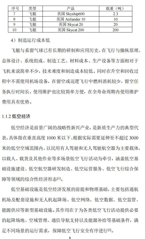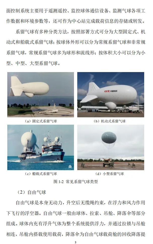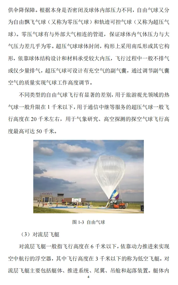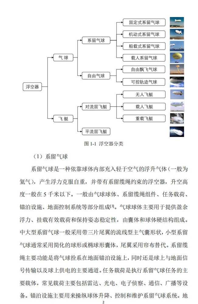 浮空器是指利用轻于空气的气体来提供升力的航空飞行,主要包括系留气球、高空气球和飞艇三类。已在低空旅游观光、通信中继、应急救援、广告宣传等领域得到了一定应用。和其它低空航空飞行器相比,浮空器具有大载荷、长航时、使用低成本、高安全性等突出优势,因此有望成为未来低空领域的热点研究和应用方向。