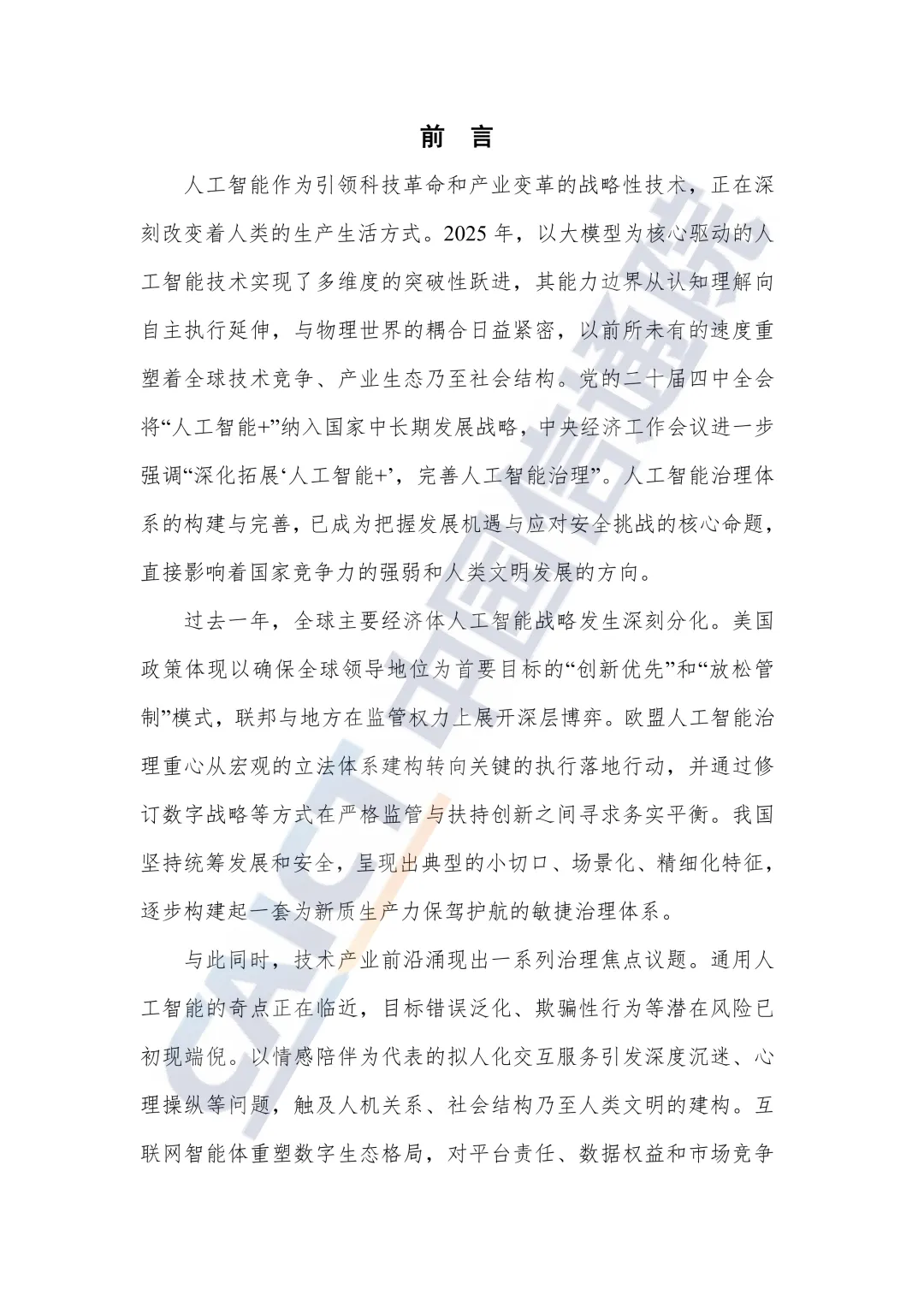 本报告的核心论点是:在人工智能(特别是通用人工智能-AGI)能力实现突破性跃进、与物理世界和社会运行深度耦合的背景下,全球治理体系面临严重的“能力鸿沟”与“结构性失衡”。各国基于不同的战略目标,选择了差异化的治理路径,而未来的治理必须直面技术特性带来的全新风险(如价值对齐失败、人机边界模糊、责任主体多元等),朝着构建敏捷、协同、以人为本的治理体系方向演进。