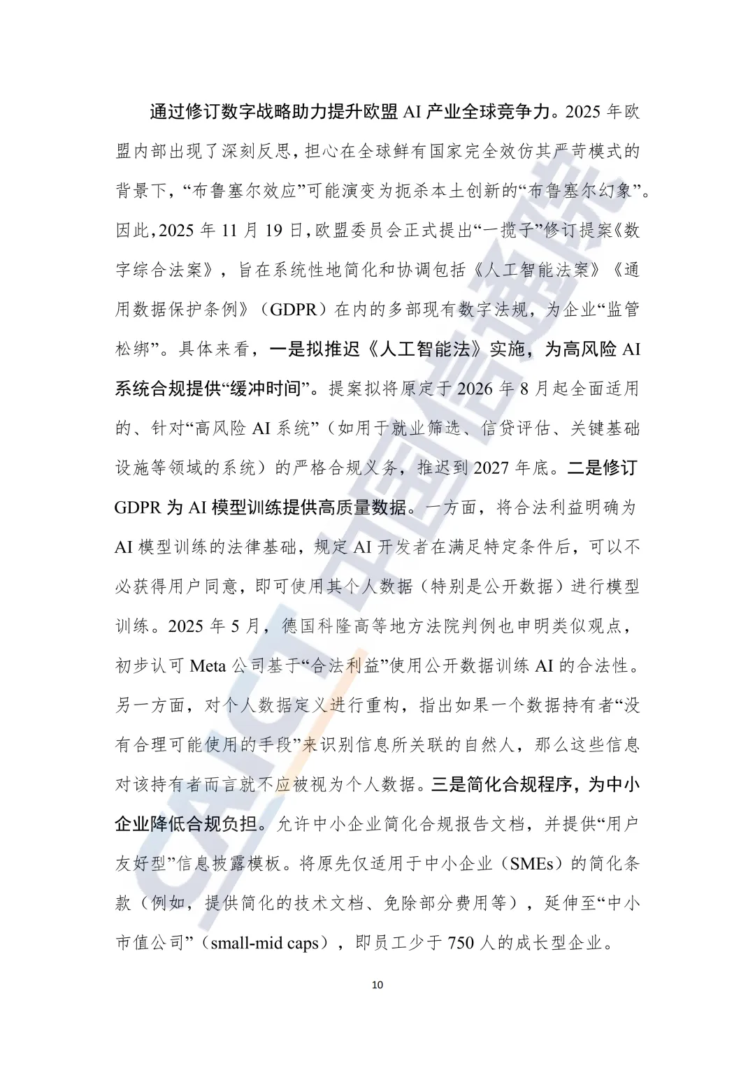 务实反思与调整:意识到严苛的“布鲁塞尔效应”可能扼杀本土创新,于2025年底提出《数字综合法案》一揽子修订提案,核心是为企业“监管松绑”,包括拟将高风险AI系统的合规义务推迟至2027年底、为AI训练数据提供法律确定性(明确“合法利益”基础)、简化中小企业合规程序。这标志着欧盟正从单纯的“规则制定者”转向务实的“监管协调者”。