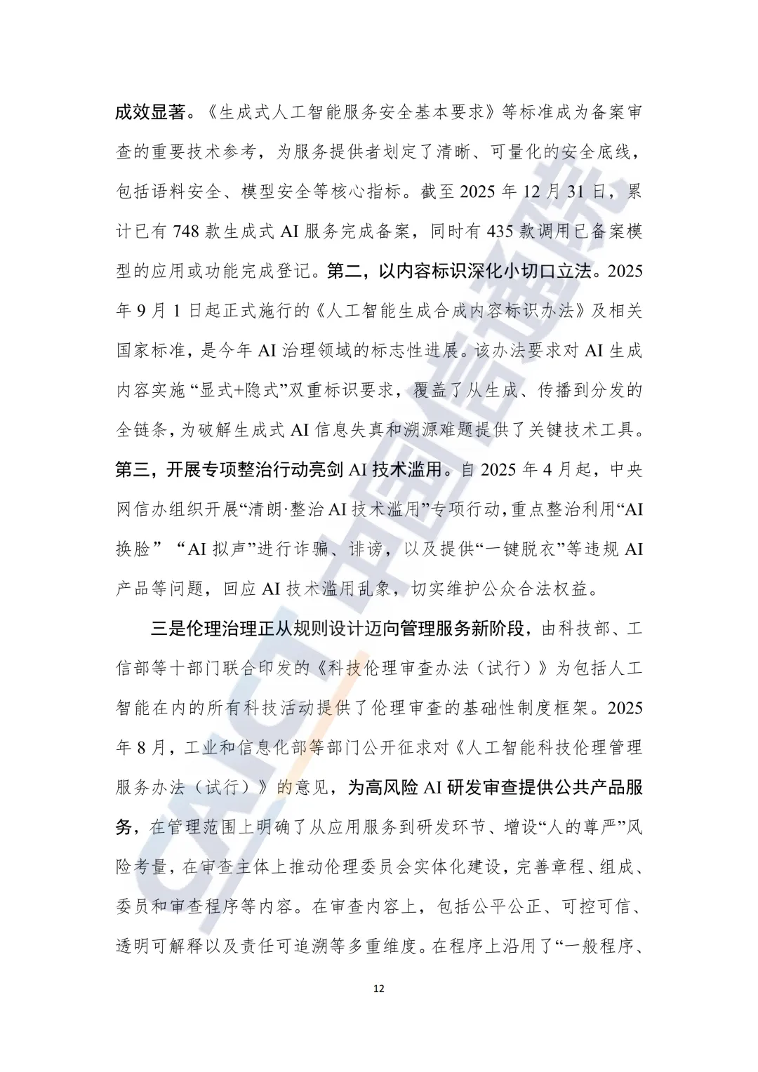 模型层:以 “备案制” 为核心的基础模型治理常态化运行(截至2025年底,748款生成式AI服务完成备案),并配套《AI生成内容标识办法》等技术性规则。