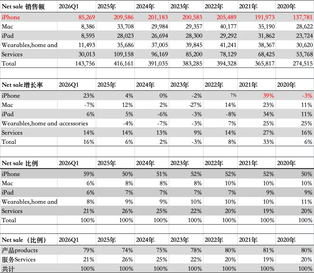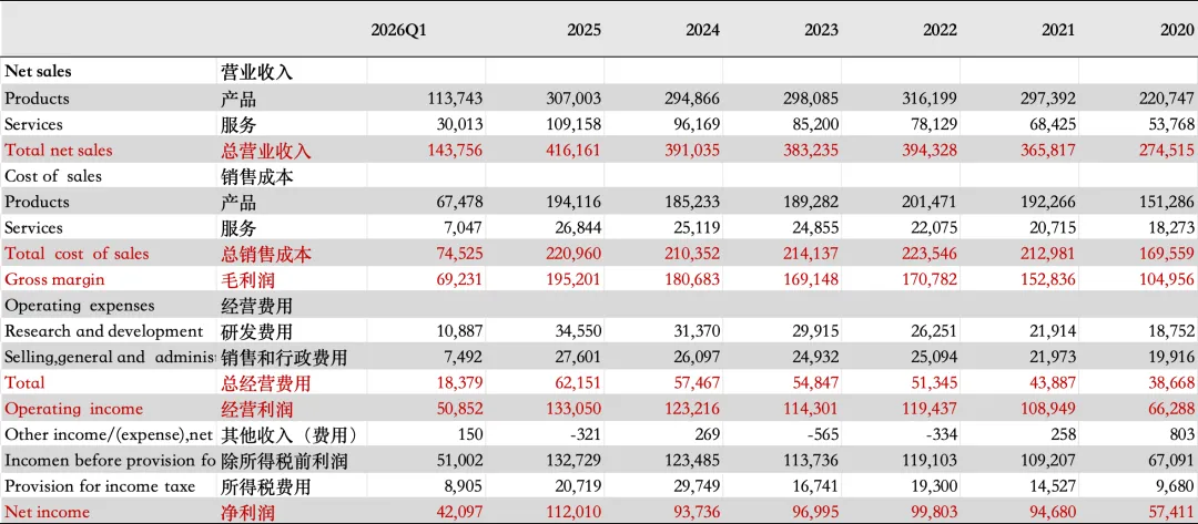 2026Q1,苹果公司总营业收入为1438亿美元,同比增长16%,创历史新高。其中产品收入为1137亿美元,同比增长16%,服务分部收入为300亿元,同比增长14%。2025财年,苹果公司总营收为4162亿美元,同比增长6%,其中产品收入为3070亿美元,同比增长4%,服务收入为1092亿美元,同比增长14%;