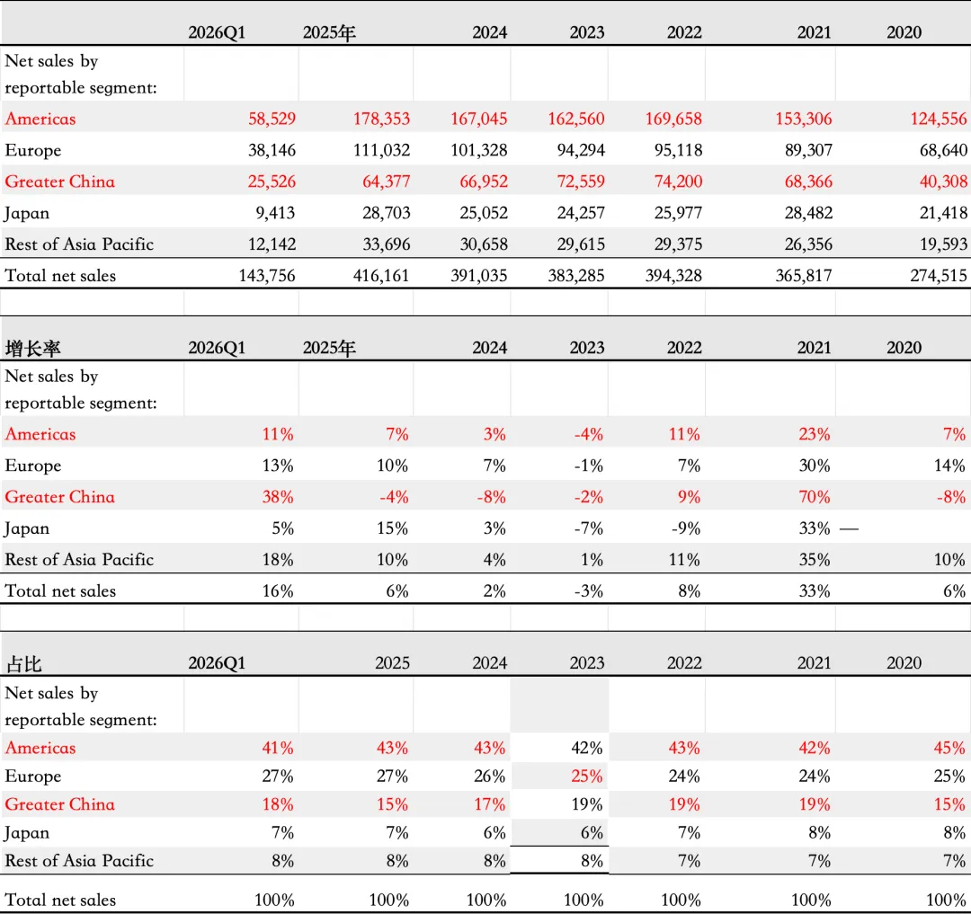 2026Q1,苹果公司在包括大中华区市场在内的所有市场都取得了正增长。