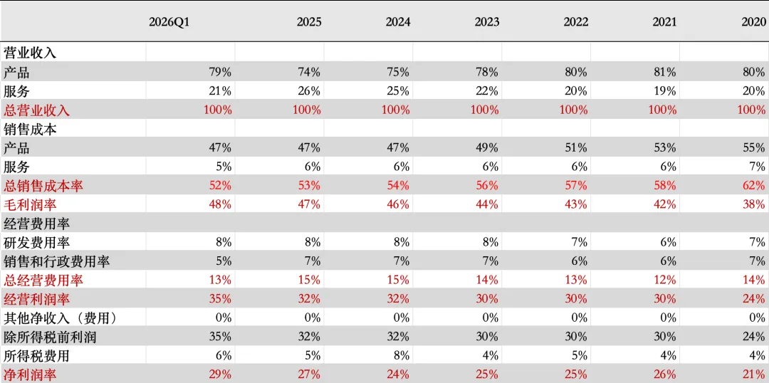 2025财年,服务分部营收占比提升至26%,毛利率提升至75.4%;产品分部毛利率36.8%,同比下降40个基点。产品分部毛利润占总毛利润比例58%,服务分部提升至为42%。随着服务分部营业收入的持续提升,服务分部毛利润比重将会继续增加。