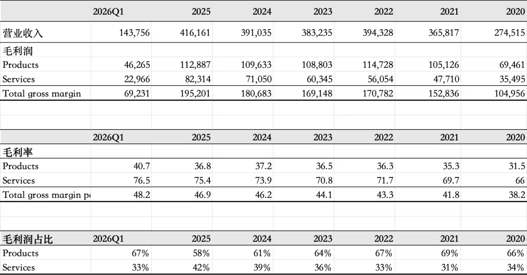 2026Q1(截止2026年12月27日季度),苹果公司总营业收入为达1438亿美元,同比增长16%,创下有史以来最好的季度业绩;2025财年苹果公司总营业收入为4162亿美元,同比增长6%,2020年至2026六年增长率分别为6%、33%、8%、-3%、2%、6%。公司毛利率上升至48.2%,主要得益于产品组合的优化以及杠杠效应。高毛利率收入的服务分部比重进一步上升。