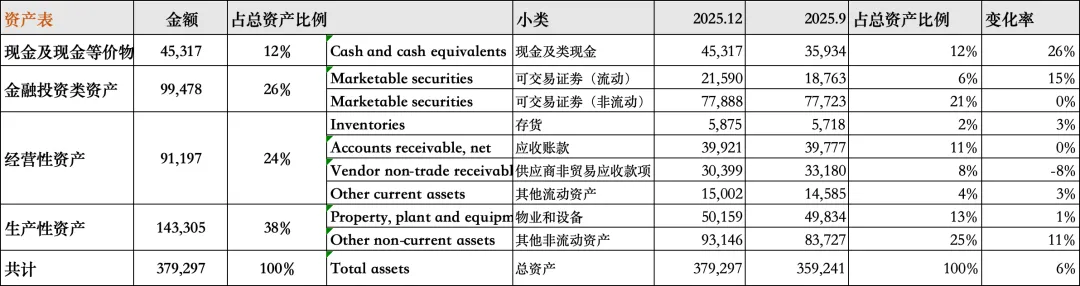 截止2025年12月27日,现金、现金等价物和可交易证劵公允价值为1448亿美元,共占总资产38%。