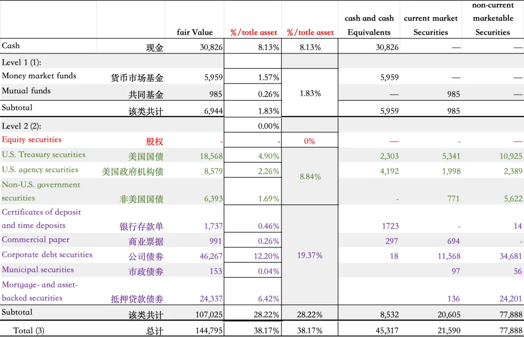 其中现金308亿美元,货币基金等类现金69亿,银行存款单17亿,占总资产超过10%;