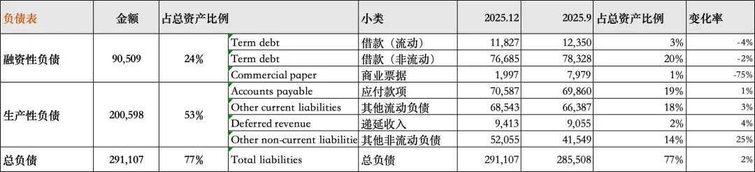 截止2025年12月27日,苹果公司总资产共计3793亿美元,对比2025年9月上升6%,比2024年12月底增加了350亿美元。总负债2910亿美元,负债占总资产77%,比去年同期下降了3个百分点。