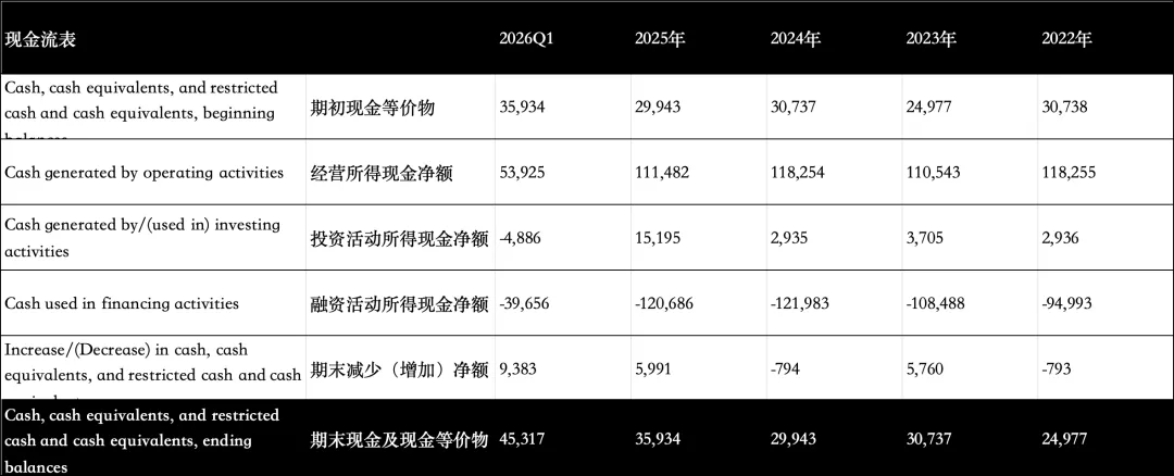 2026Q1,经营活动所得现金净额为539亿美金,大于净利润421亿美元。 2025财年,经营活动现金流为1115亿美元,与净利润1120亿美元持平。 2022年至2024财年,经营活动所得现金流超过1100亿美元,都超过净利润。