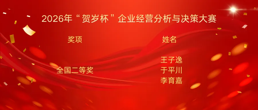近日,2026年“贺岁杯”企业经营分析与决策大赛全国总决赛传来捷报!我社成员王子逸率队出征,凭借扎实的专业功底、缜密的分析逻辑与默契的团队协作,在全国众多高校的优秀队伍中脱颖而出,一举斩获全国二等奖,为学社再添荣光!
