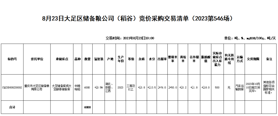 受重庆市大足区储备粮有限公司委托,重庆市粮油批发市场有限责任公司(即国家粮食重庆交易中心,以下简称“批发市场”)定于2023年8月23日10:00举办大足区储备粮公司(稻谷)竞价采购交易会,现将有关事项公告如下:
