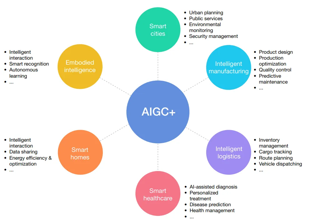 IGC领域的近期突破已实现内容创新、决策优化、效率提升及生活品质改善。随着技术持续演进,AIGC有望带来更具颠覆性的变革性创新。在数字化转型加速的背景下转型浪潮中,AIGC已广泛融入智能家居、智慧城市、智能医疗、智能制造、智能物流运输及具身智能等领域。未来这些应用场景的拓展潜力更为巨大。