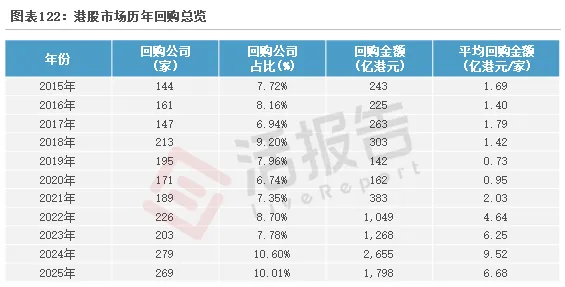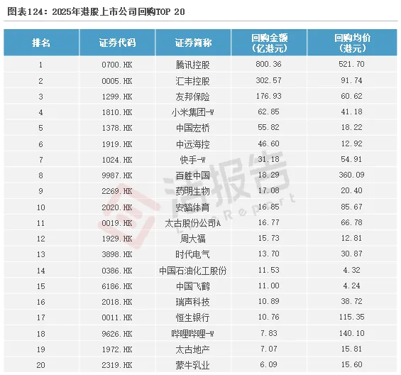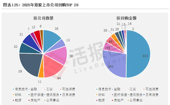 股份回购(Sharebuy-back)是指回购股份或要约人提出回购、赎回或以其他方式取得该要约人的股份的要约,包括私有化、协议安排或构成全部或部分该项要约的其他重组方式。长期以来,恒生指数与回购公司数目呈现负相关性,指数越低,进行回购维护股价的上市公司越多,回购行为越频繁。从历史经验看,回购往往发生在熊市,但回购信号通常也预示市场底部,随后出现反弹的概率较高。自2021年以来,港股市场已连续四年回购规模超过千亿港元!2025年港股共有269家公司进行了股份回购,占上市公司总数的10%;累计回购金额达1798亿港元,仅次于2024年的2655亿历史纪录。2025年,腾讯控股以800亿港元规模继续稳坐港股“回购王”。汇丰控股、友邦保险分列其后,分别回购了303亿、177亿港元。此外,还有14家公司的回购金额超10亿港元,包括小米集团-W、中国宏桥、中远海控、快手-W、百胜中国、药明生物、安踏体育等。2025年开展回购行动的港股上市公司,主要集中在信息技术、金融、工业、可选消费及医疗保健几个领域。其中,信息技术行业整体回购规模占据半壁江山,是市场回购活动的主力军。除腾讯控股独占鳌头外,小米集团-W、瑞声科技、哔哩哔哩-W等科技公司也在积极回购股份。此外,医疗保健行业的回购公司数量最多,包括药明生物、固生堂、石药集团、和铂医药-B等,但行业整体金额并不大,这与众多18A生物技术公司尚未盈利、亟需资金发展的产业阶段有关。温馨提示:请将“活报告”设为星标,或文章点赞、在看,感谢您的关注。