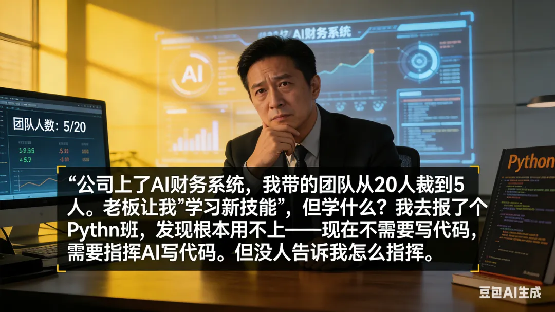 “公司上了AI财务系统,我带的团队从20人裁到5人。老板让我’学习新技能’,但学什么?我去报了个Python班,发现根本用不上——现在不需要写代码,需要指挥AI写代码。但没人告诉我怎么指挥。”