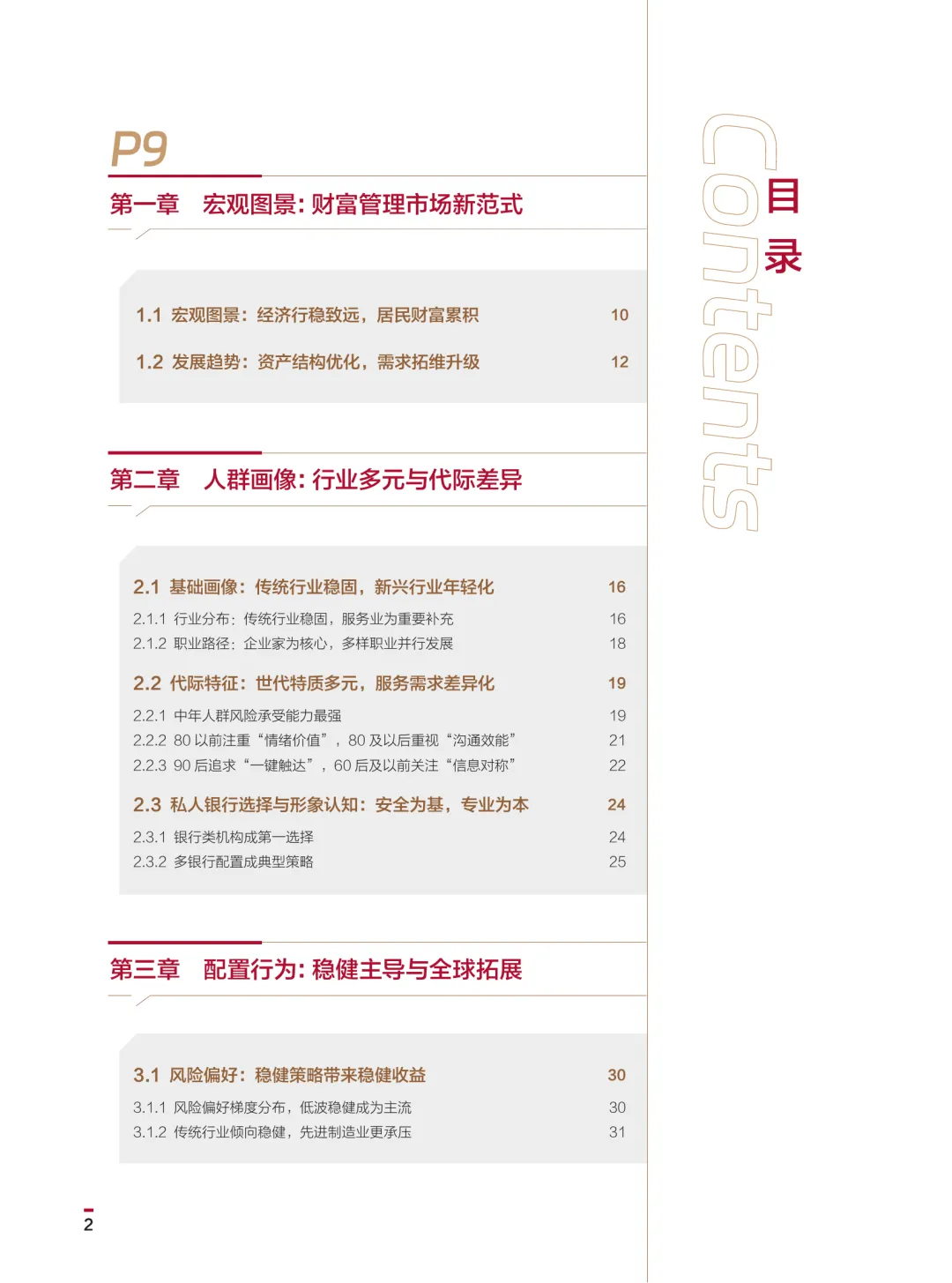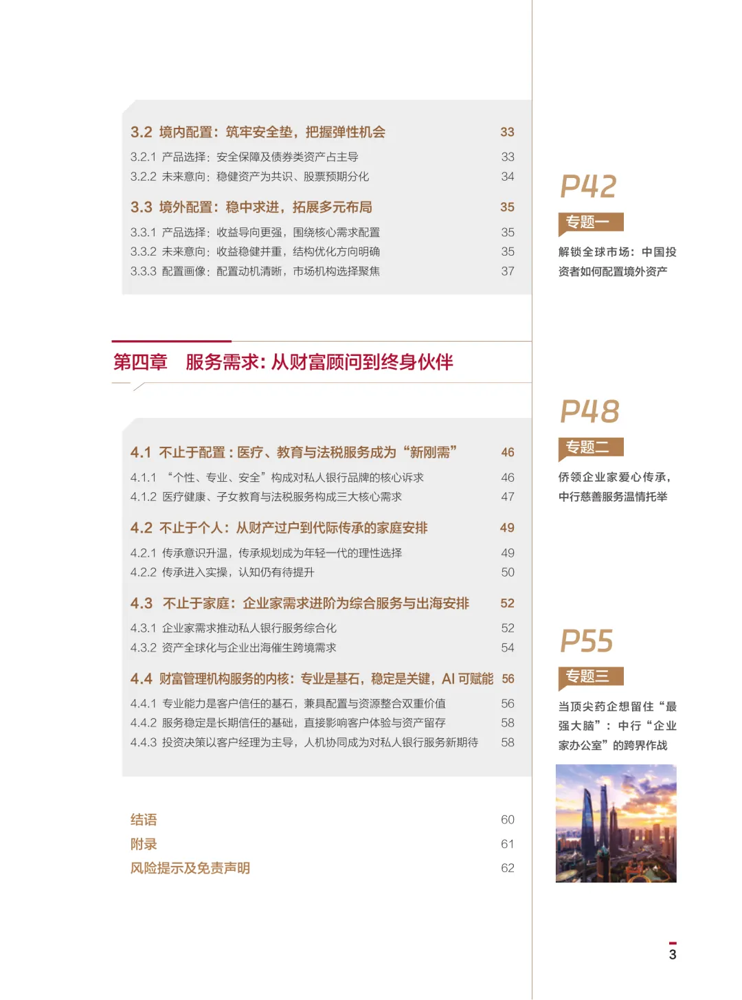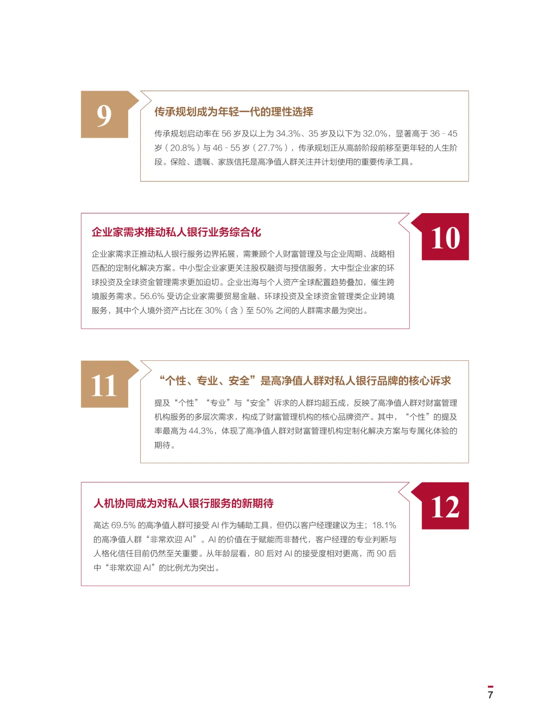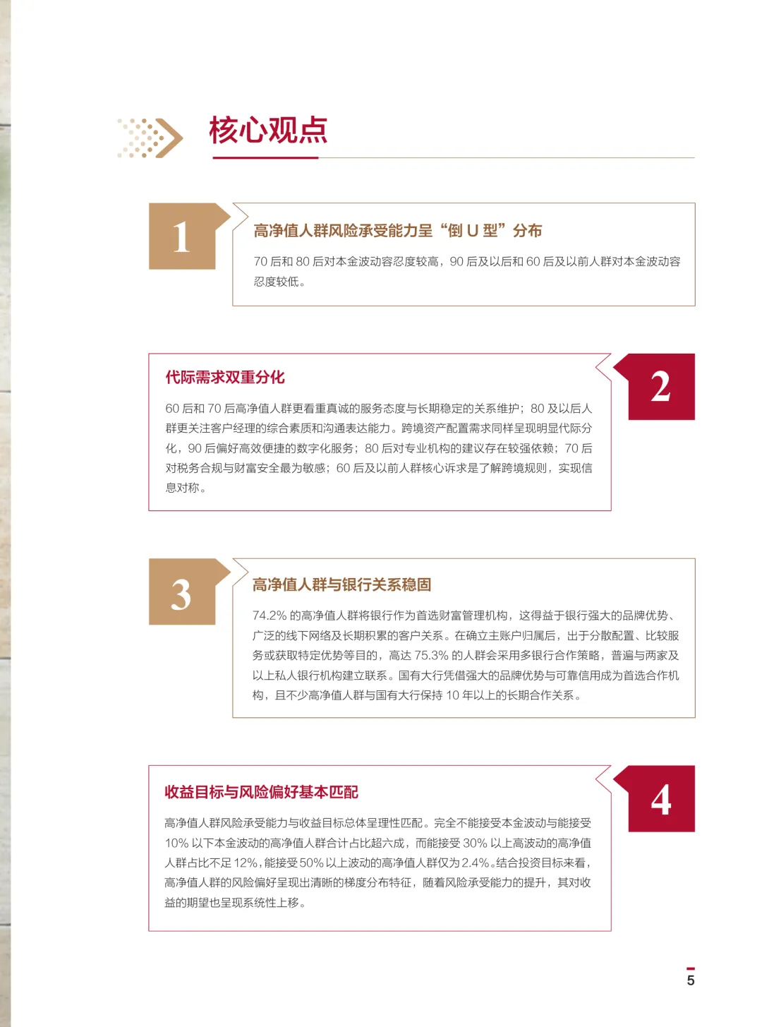 中国高净值人群财富管理白皮书聚焦于2026年市场环境下的财富管理趋势与需求。中国经济持续稳定发展,居民财富不断积累,资产配置需求日益多样化,为财富管理行业带来新的机遇与挑战。调研高净值人群的财富管理行为呈现出稳健为主、全球布局的趋势。在境内配置中,安全保障和债券类资产占据主导地位,同时对股票市场的预期呈现分化。境外配置则更注重收益稳定性与结构优化,产品选择围绕核心需求展开。从人群特征来看,不同代际之间存在明显差异。中年人群风险承受能力较强,80年前出生者更关注情绪价值,而80后及之后群体更重视沟通效率。90后偏好便捷触达方式,60后则更注重信息对称性。私人银行的选择上,银行类机构仍是首选,多银行配置成为常见策略。服务需求方面,高净值人群不仅关注资产配置,还对医疗、教育、法税等综合服务提出更高要求。家庭传承意识增强,年轻一代开始理性规划遗产安排。企业家则面临更复杂的综合服务与跨境运营需求。财富管理机构需以专业能力为基础,确保服务稳定,同时探索人工智能等技术的赋能空间。客户信任建立在专业与资源整合之上,而长期关系依赖于稳定的体验与持续的服务质量。高净值人群的财富管理需求正在向多元化、个性化和全球化方向演进,推动行业向更高质量发展。