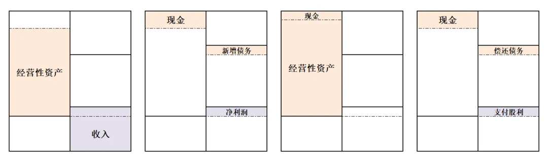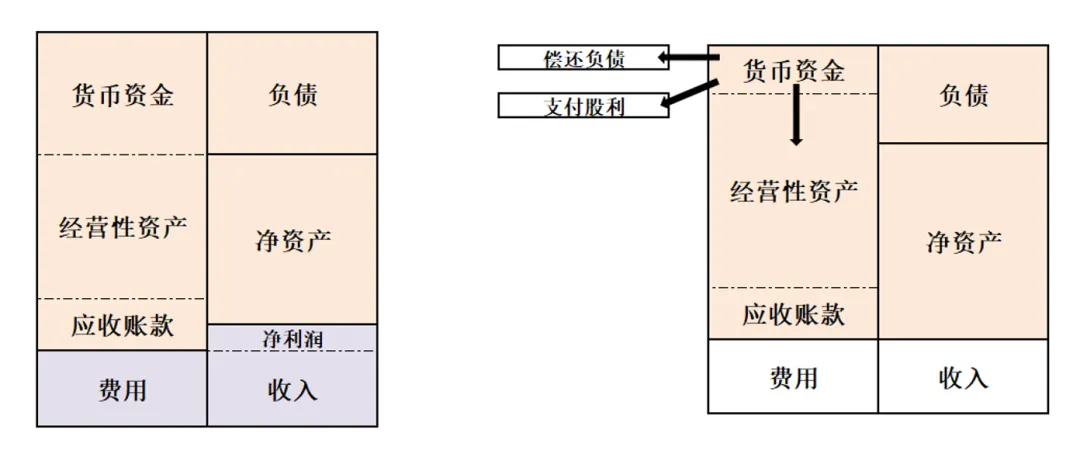 比如现金通过投资活动转化为经营性资产,新增债务或偿还债务,赚回净利润或者支付股利及贷款利息,也会引起现金变化。
