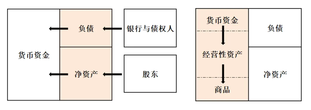 资产负债表的右侧反映“资金的来源”,比如从银行借款就是负债(非自有资金),自己出资的话就是净资产(自有资金)。左侧则反映“资金的用途”,比如拿去买厂房买设备变成固定资产,买原材料生产产品变成存货等。