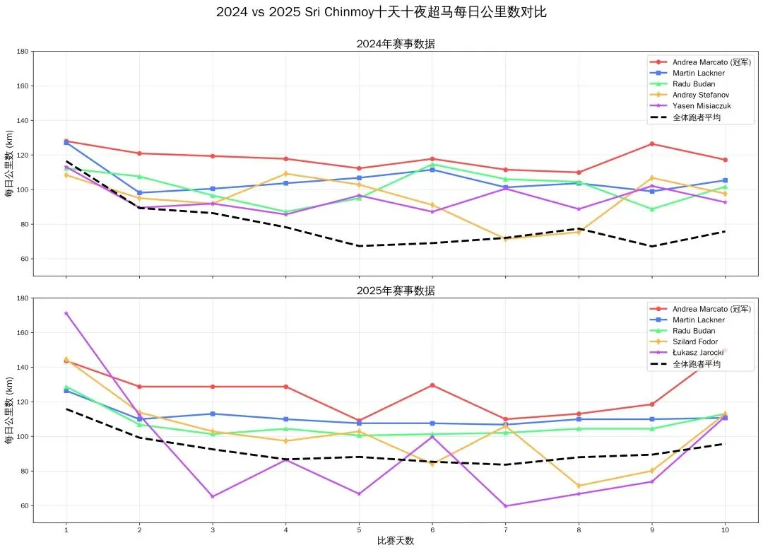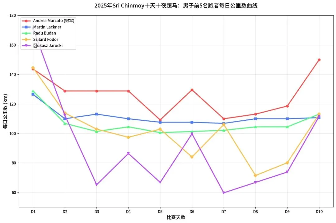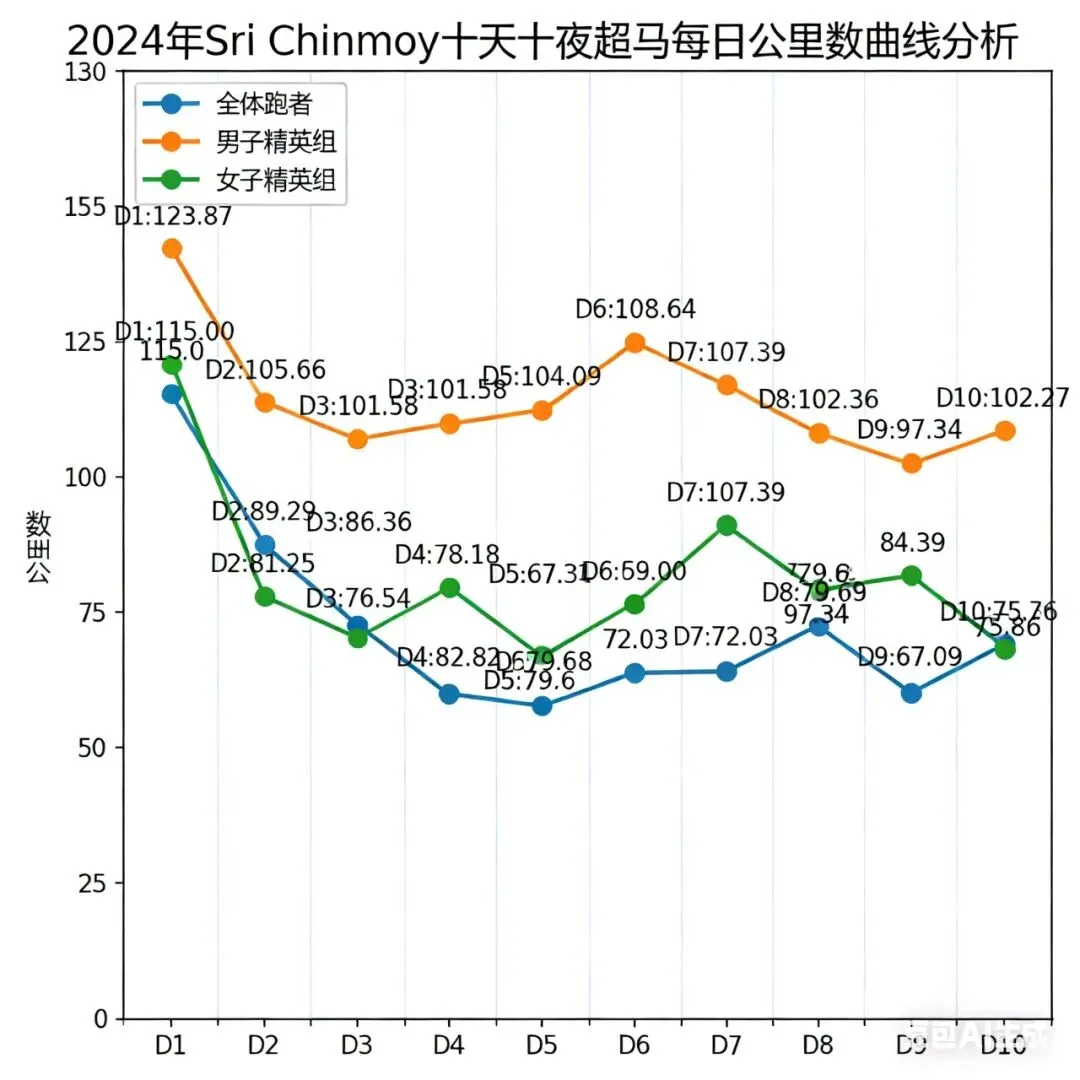 - 男子精英:全程稳定,D1=142.7km,D7谷底仅小幅下降,D10反弹至116.3km,节奏控制力极强。