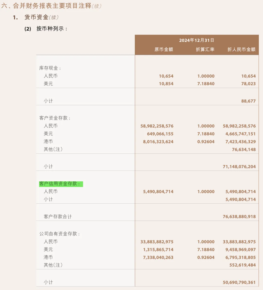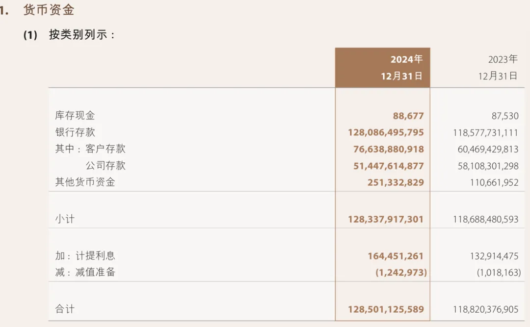 其银行存款还是将类别给列示出来,因为中金的业务性质与其他传统企业有所不同,银行存款还涵盖了客户的存款,因此就会出现两个账户。