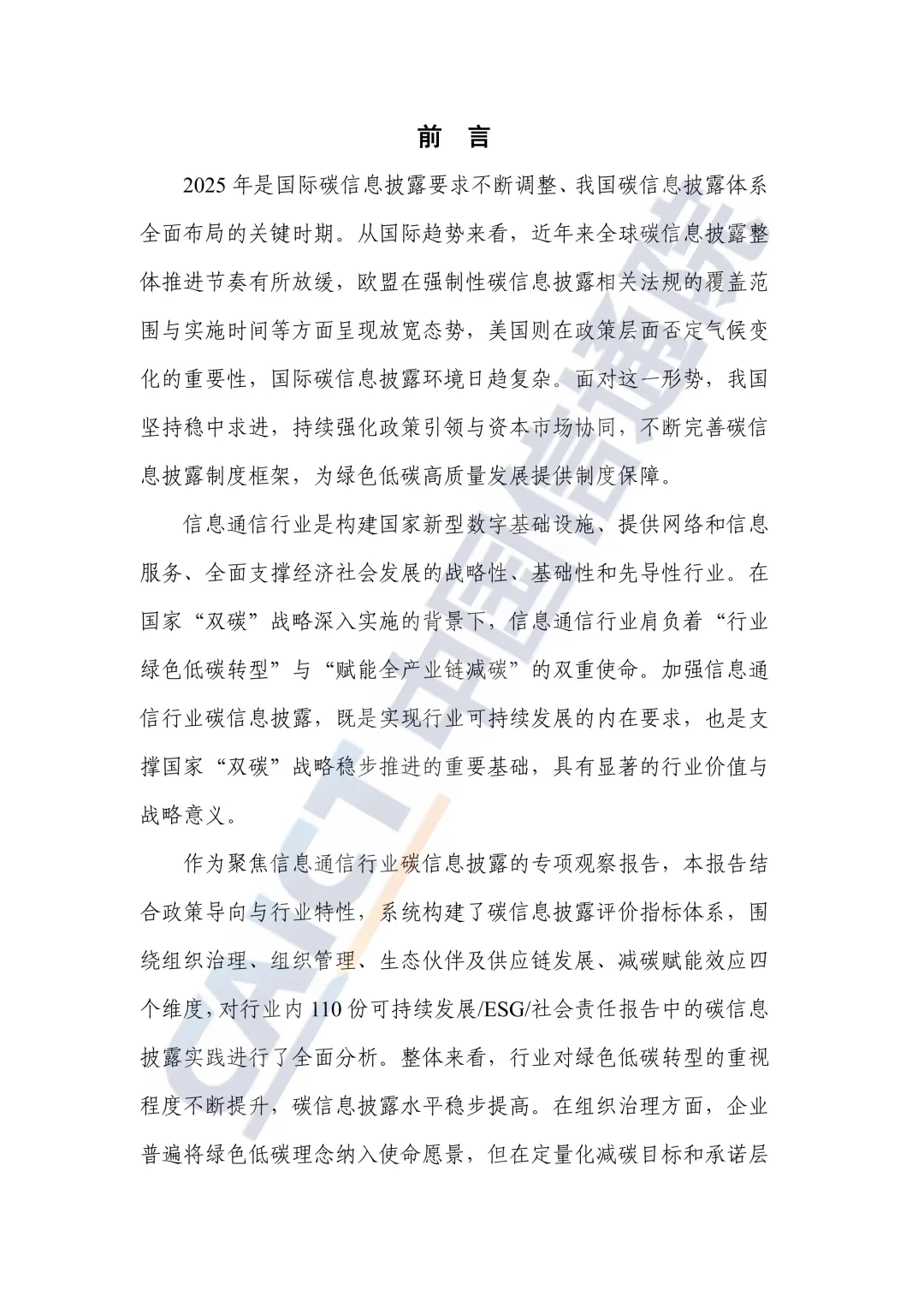 本报告并非一份简单的现状描述,而是一份具有前瞻性、系统性的行业洞察。其核心价值在于:在“双碳”战略背景下,以“信息披露”为切入口,系统评估信息通信行业(ICT行业)的绿色低碳实践水平,并揭示其“自我转型”与“赋能他者”的双重角色。 报告构建了专属的评价指标体系,通过对110份企业公开报告的分析,量化呈现了行业进展与短板,为政策制定、企业行动和投资决策提供了科学依据。