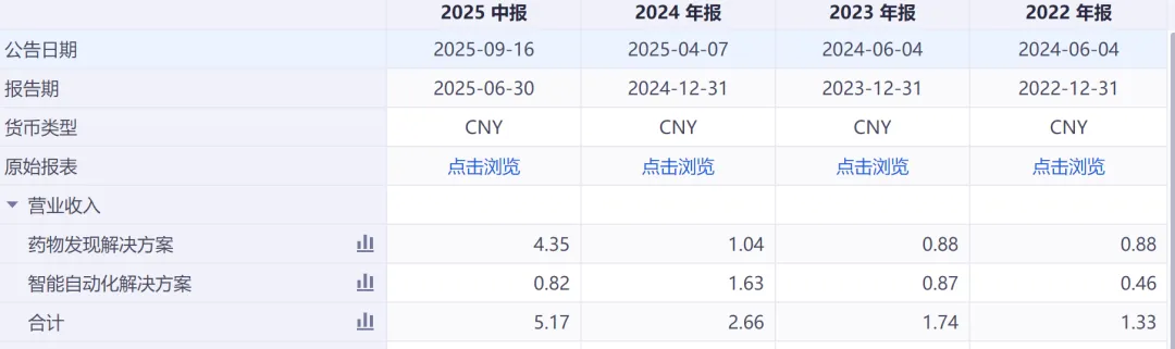 从收入构成看,虽然公司号称要赋能诸多领域,目前最主要的收入还是药物研发的CRO服务收入,其它领域暂未形成完善的商业模式。药物发现解决方案里最重磅的是与DoveTree公司最高总金额达59.9亿美金的潜在交易,其中5100万美金已收取,也是2025年中报业绩大幅增长的原因。