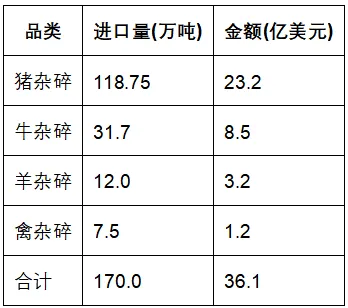 2025年中国肉类及杂碎总进口量609万吨,其中肉类副产品(杂碎)进口量约170万吨,占总肉类进口量的28%,整体呈现“总量微降、占比提升”的态势。