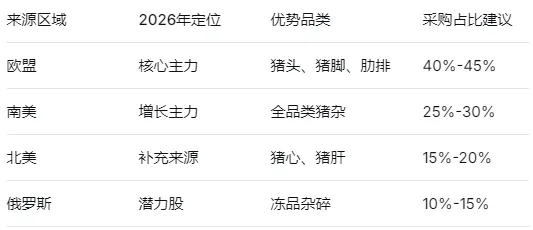 - 新兴来源:南美(巴西、阿根廷)、北美(美国、加拿大)份额将持续提升,建议2026年新增供应商认证向美洲倾斜
