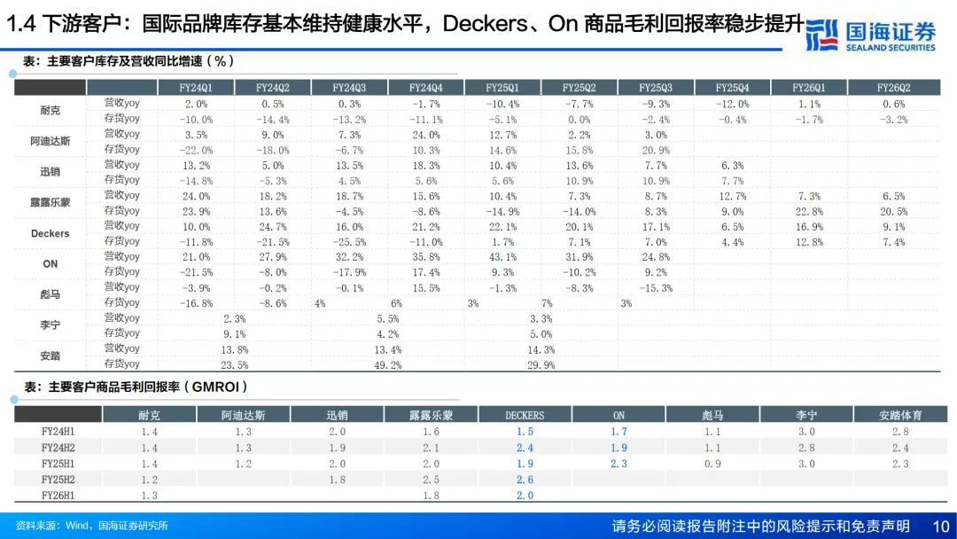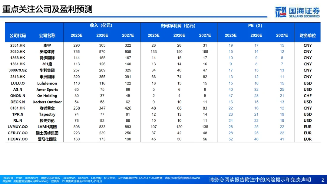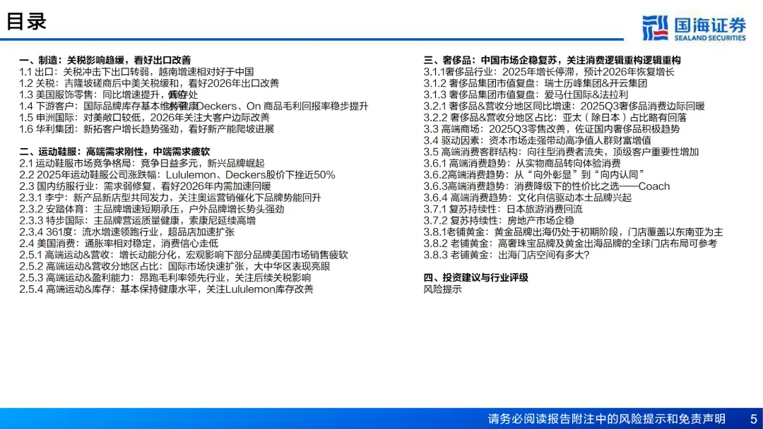 在运动鞋服行业,国内品牌呈现弱修复状态,但高端定位品牌展现出较强韧性。随着宏观经济的改善和政策的催化,预计2026年将有向上修复的空间。国际高端运动品牌增长动能出现分化,但考虑到品牌力及国际市场快速扩张,预计2026年将有边际改善。