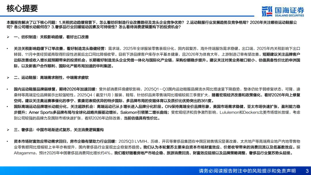 报告维持对海外消费及纺服行业的“推荐”评级,强调了在关税扰动趋缓背景下,纺织制造行业的改善路径及龙头企业的竞争优势。