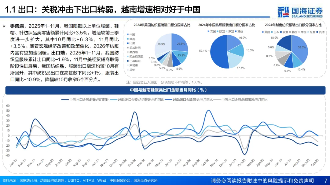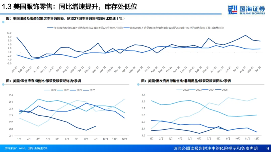 报告指出,2025年全球服装零售表现分化,国内呈现弱复苏态势,而海外终端服饰需求保持稳健。
