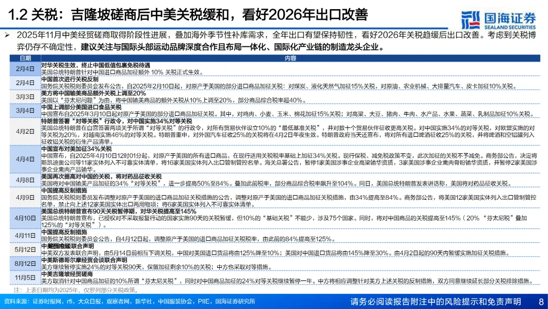 在出口方面,尽管2025年受到关税影响出口转弱,但随着中美经贸磋商取得阶段性进展,出口同比降幅有所收窄。预计2026年体育大年的到来,将带动上游制造订单的改善。长期来看,制造龙头企业凭借一体化与国际化产业链,有望稳步提升采购份额。
