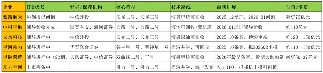- 第三梯队(辅导中):天兵科技、星河动力、星际荣耀