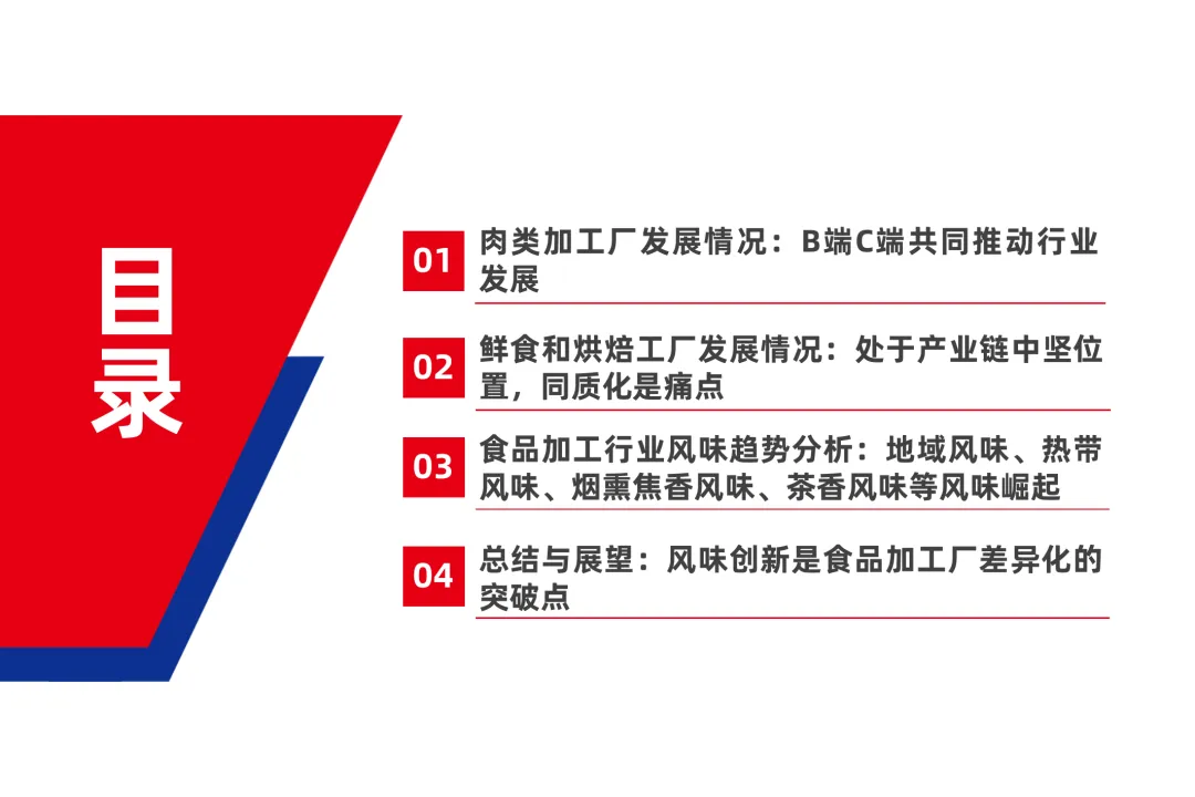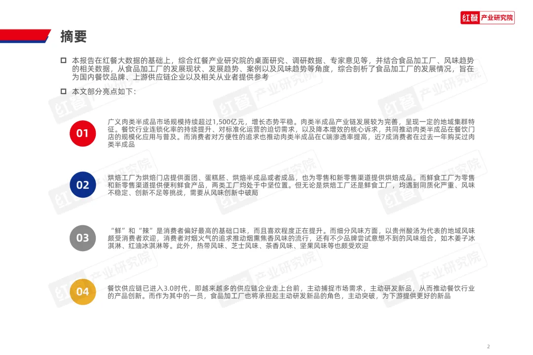 2026年食品加工产业与风味趋势食品加工厂在餐饮产业链中扮演着关键角色,其发展质量直接影响餐饮行业的供给能力、运营效率和创新能力。食品加工行业已进入产品创新与智能化阶段,供应链企业正主动捕捉市场变化,推动产品升级。肉类半成品市场规模持续扩大,超过1500亿元,产业链日趋完善,呈现区域集中特征。餐饮连锁化趋势加快,对标准化和降本增效的需求促使肉类半成品在餐饮门店广泛应用,同时消费者对便捷性的追求也提升了其在C端的渗透率。烘焙工厂和鲜食工厂作为产业链中坚力量,为零售和新零售渠道提供产品。但两者均面临同质化严重、风味不稳定和创新不足等问题,亟需通过风味创新寻求突破。“鲜”与“辣”是消费者最青睐的基础口味,且偏好持续上升。地域风味如贵州酸汤受到欢迎,烟熏焦香因烟火气的回归而流行。木姜子冰淇淋、红油冰淇淋等新奇组合也引发关注。热带风味、芝士风味、茶香风味、坚果风味等同样具备较高吸引力。食品加工行业正迈向3.0时代,供应链企业积极研发新品,推动餐饮产品创新。食品加工厂作为其中重要一环,需主动承担研发职责,为下游提供更具竞争力的产品。从历史发展看,食品加工行业经历了从手工作坊到机械化、自动化,再到智能化的过程。如今,技术进步不断拓展食材品类和风味维度,为餐饮企业提供差异化优势。风味创新将成为食品加工厂实现差异化的关键路径。