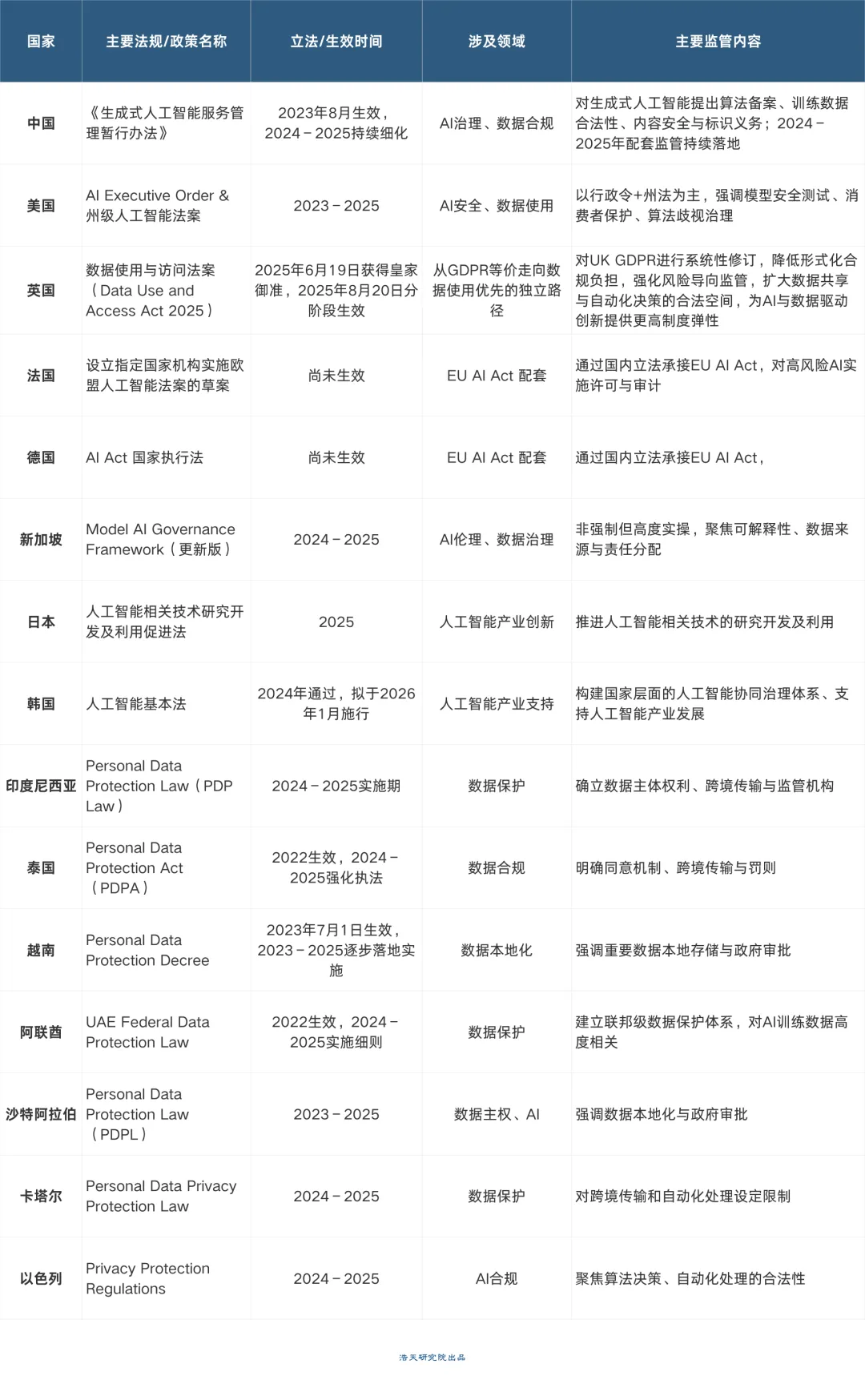 日本、韩国通过立法强化国家人工智能发展框架、科研能力与人才体系建设,将监管与人工智能竞争力提升绑定。中东与东南亚地区正在形成以国家战略引导、框架性规则与监管沙盒相结合的“增长型监管”路径,强调执行效率、产业导向与区域协同。