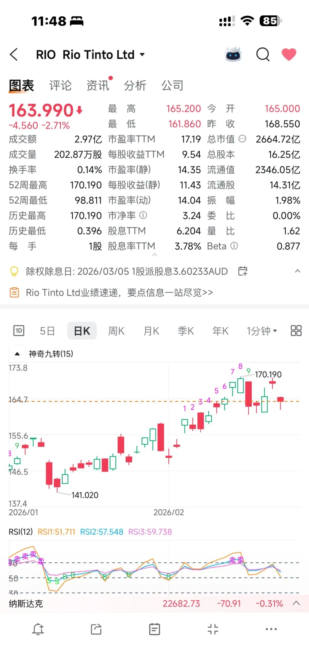 铁矿承压、铜铝托底、盈利持平、高股息维持;市场因铁矿走弱+业绩略逊预期,2 月 19 日美股收跌 -2.62%。